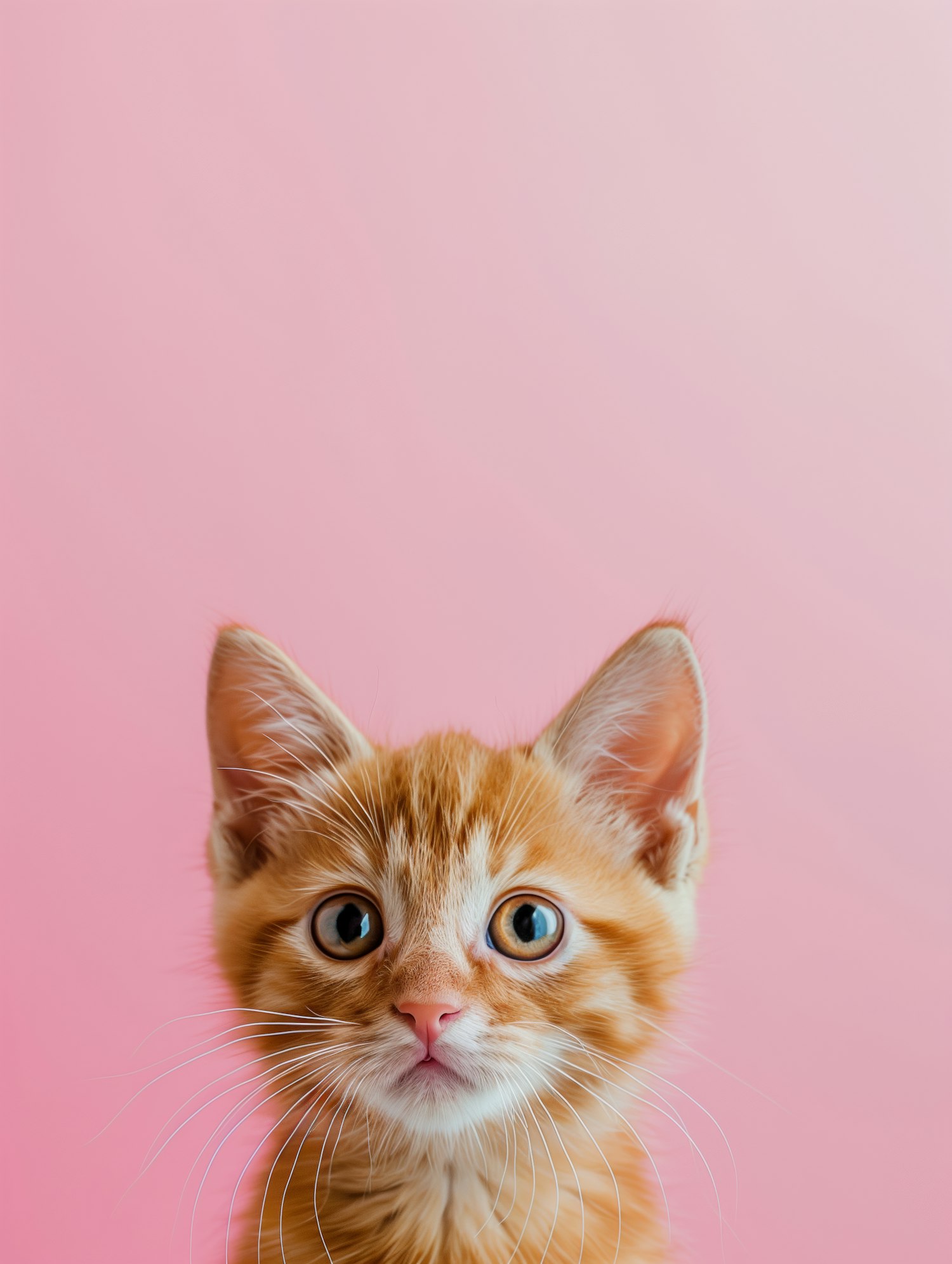 Adorable orange tabby kitten with blue eyes against a soft pink background, showcasing its fluffy fur and curious expression.