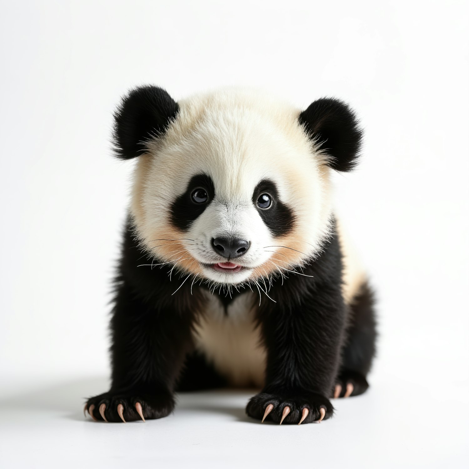 Adorable panda cub with expressive eyes and fluffy fur sits on a white background, showcasing its cute and playful demeanor.
