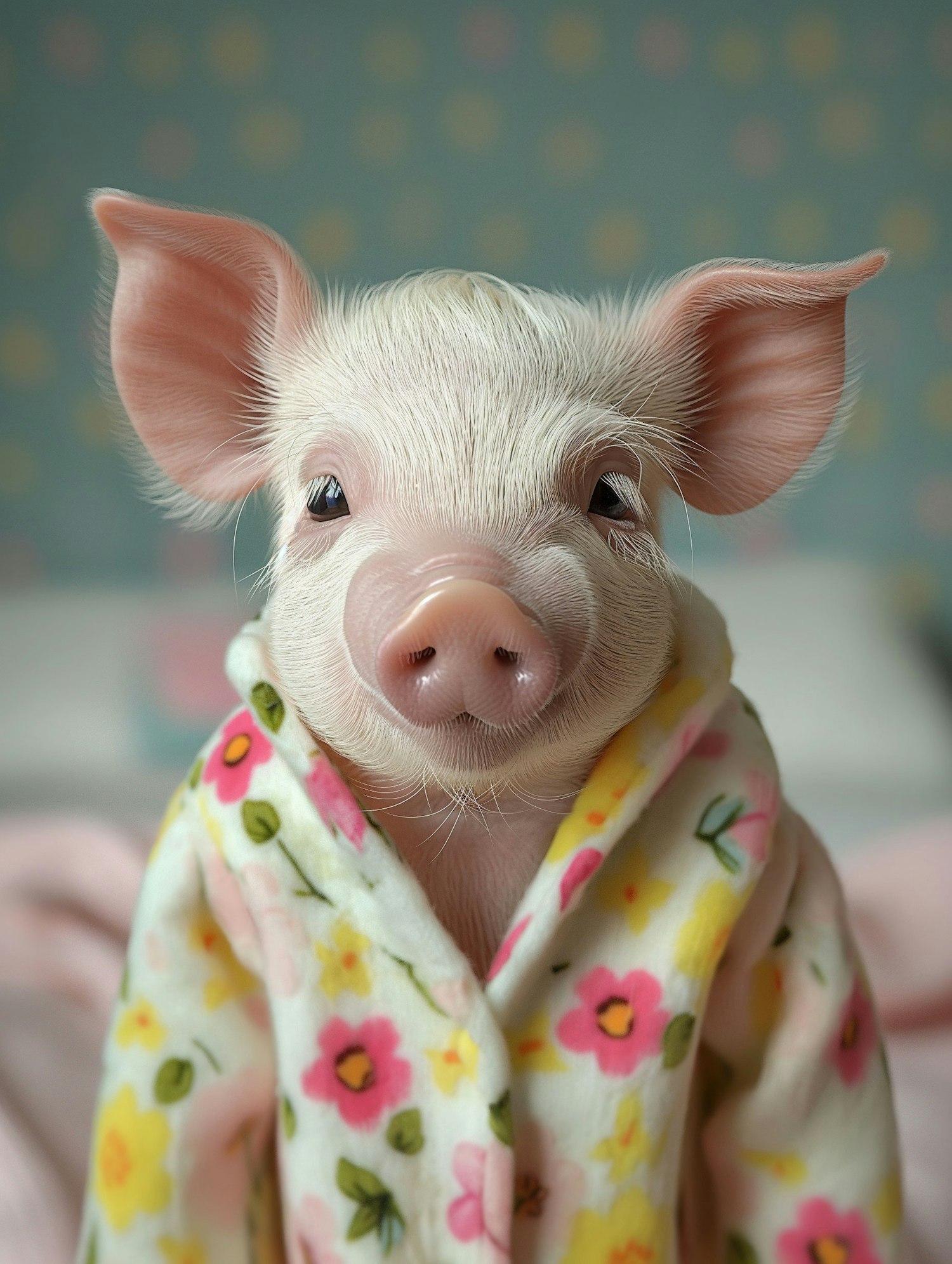 Adorable piglet in a floral robe with a pastel background, showcasing a cute and whimsical scene.