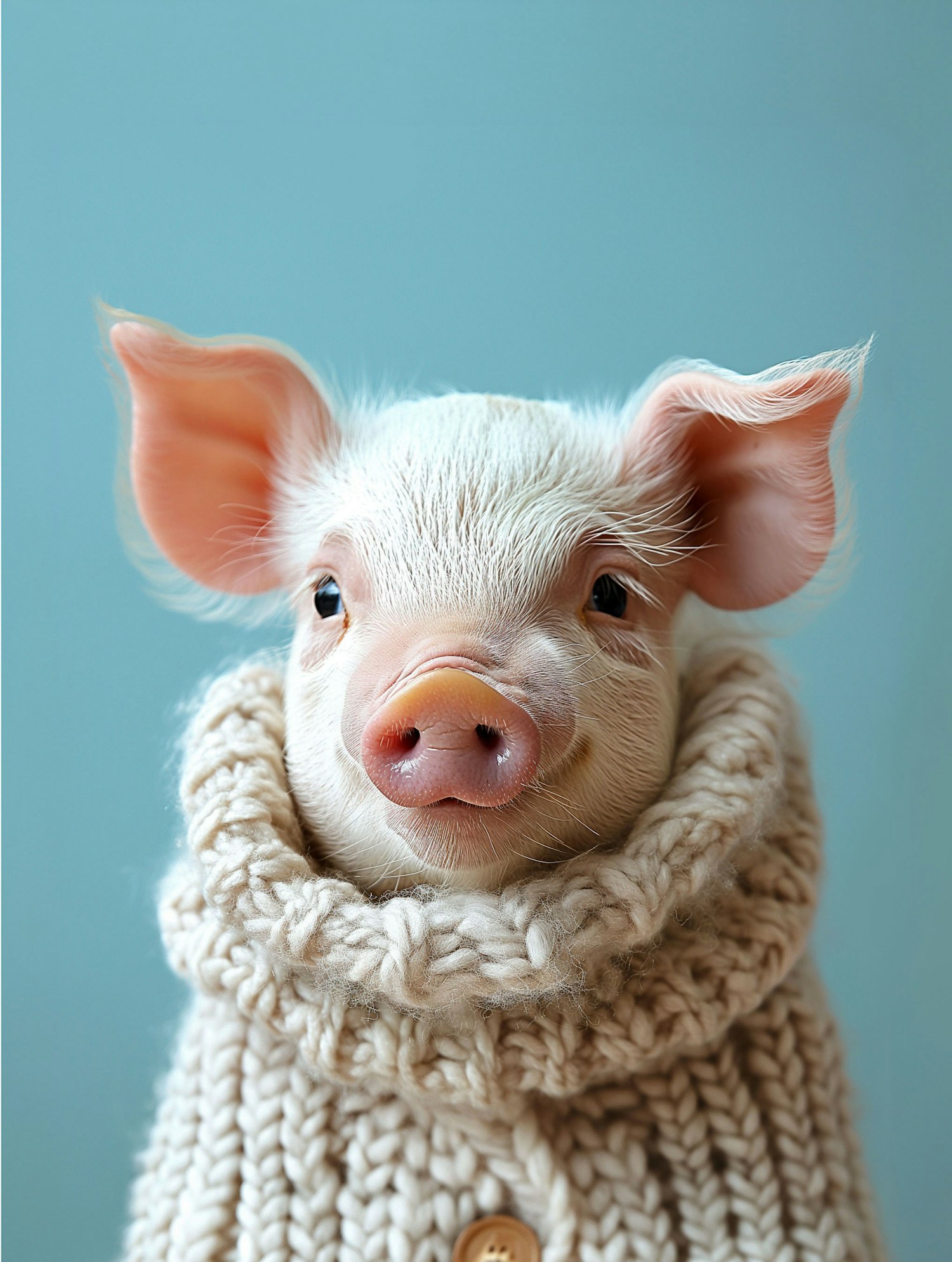 Adorable piglet in a cozy knitted sweater against a calming blue background, showcasing a whimsical and heartwarming scene.