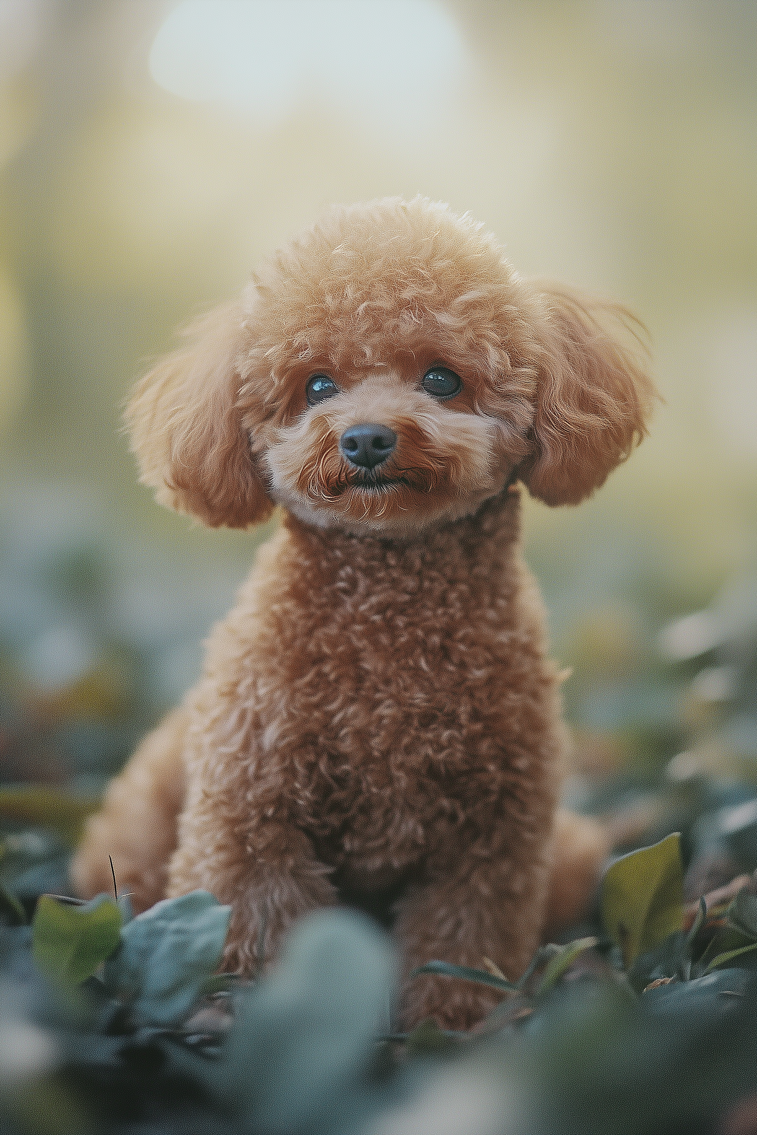 Adorable brown poodle with curly fur sits in a serene outdoor setting, surrounded by soft-focus green foliage and warm lighting.