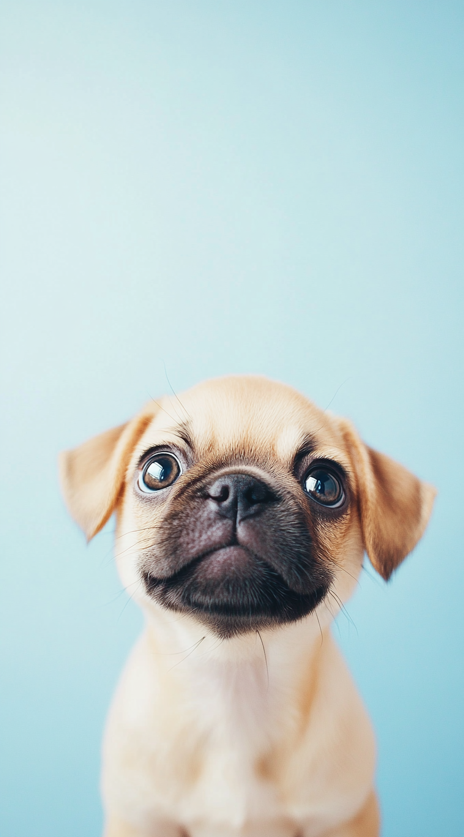Adorable pug puppy with wide eyes and a curious expression against a light blue background. Perfect for pet lovers!