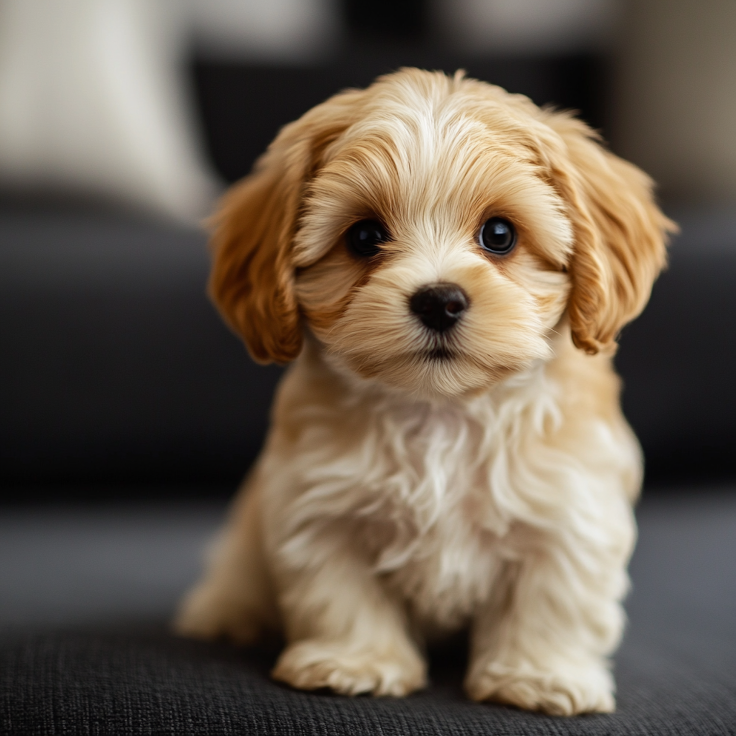 Adorable fluffy puppy with light brown and white fur sitting on a dark gray couch, looking curiously with big dark eyes.
