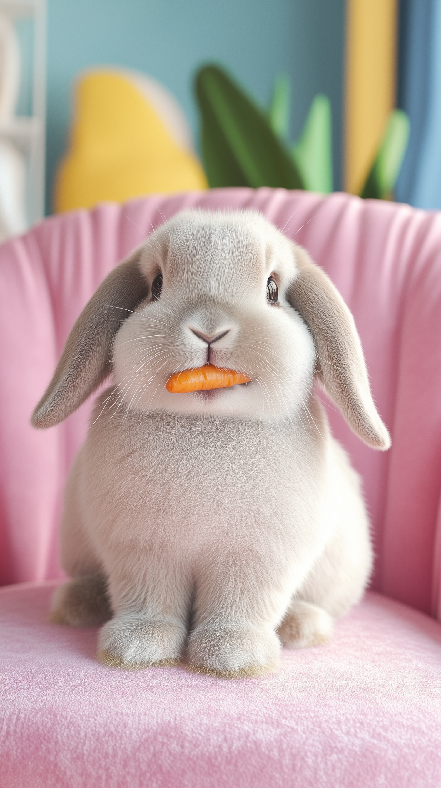 Adorable fluffy rabbit with a carrot on a pink chair, surrounded by soft pastel colors. Perfect for animal lovers.