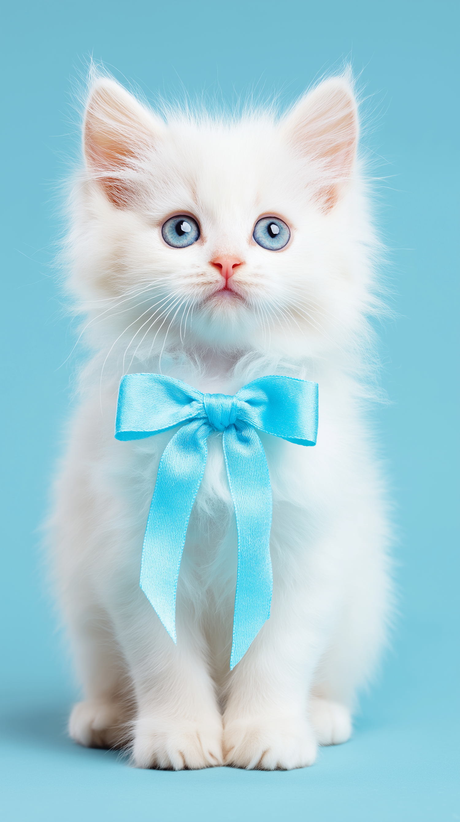 Adorable white kitten with blue eyes and a blue ribbon bow, sitting against a light blue background.