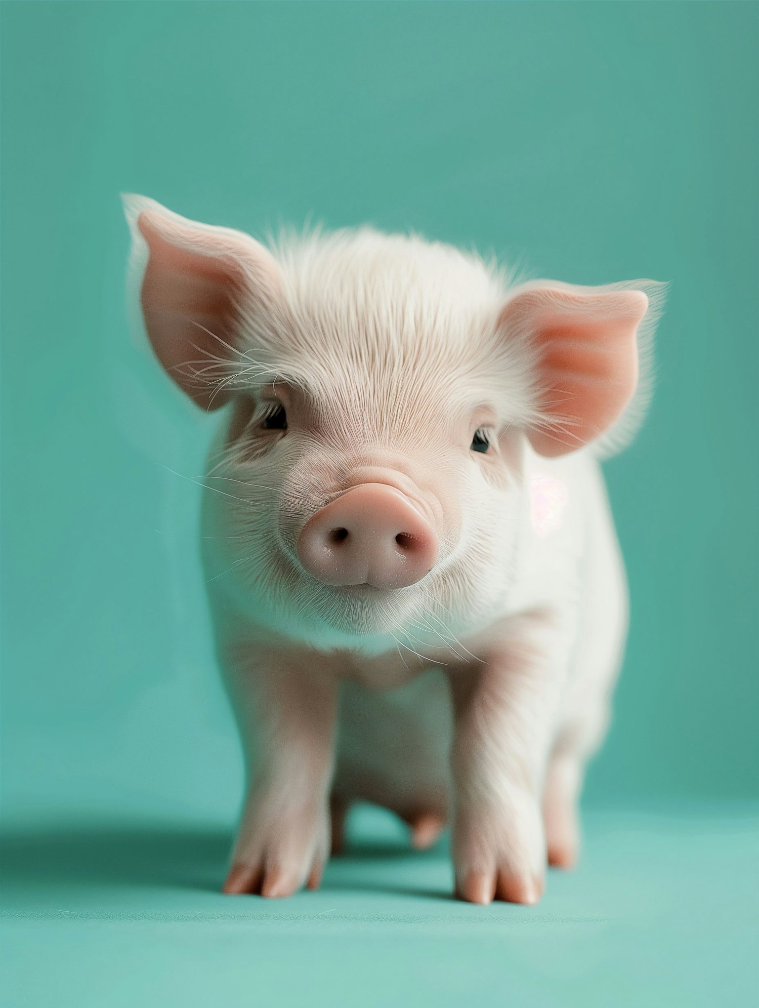 Adorable piglet with pale pink skin against a turquoise background, showcasing its cute and inquisitive expression.