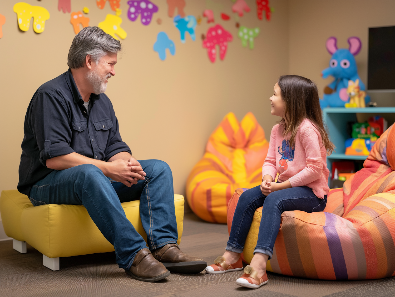 A friendly conversation in a colorful playroom between a bearded man and a young girl, surrounded by toys and vibrant decor.