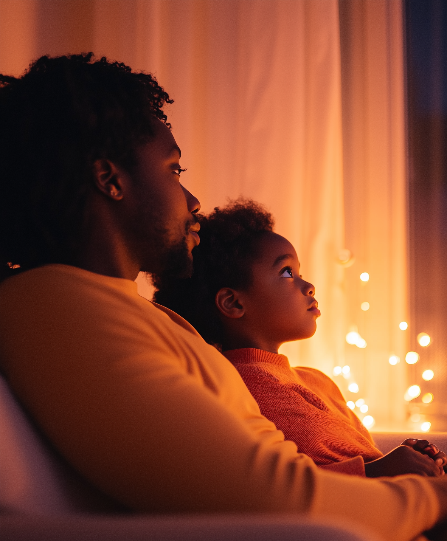 A father and daughter share a serene moment, bathed in warm light with fairy lights in the background, creating a cozy atmosphere.