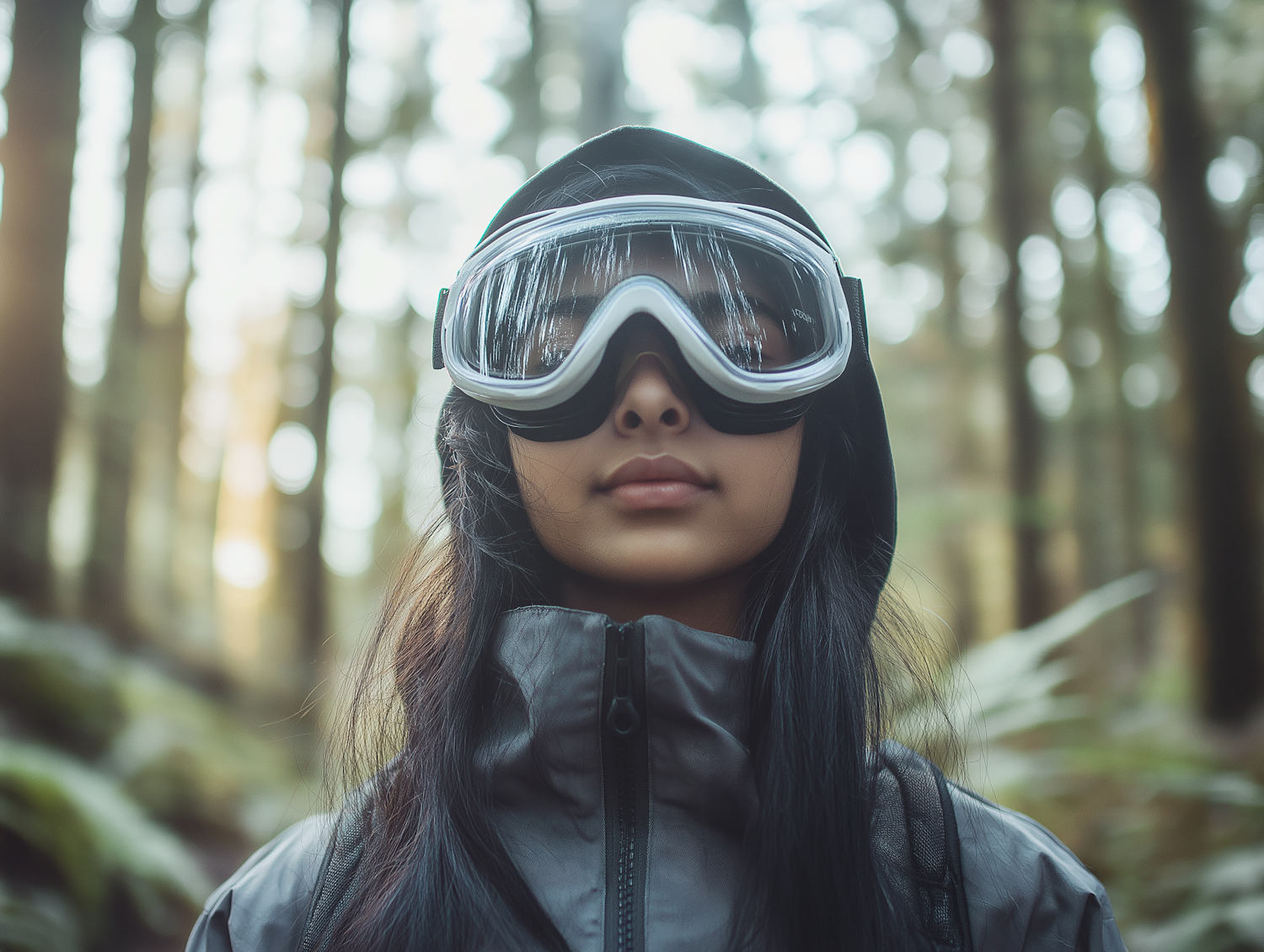 Young woman in a forest wearing a hooded jacket and reflective goggles, surrounded by tall trees and soft natural light.