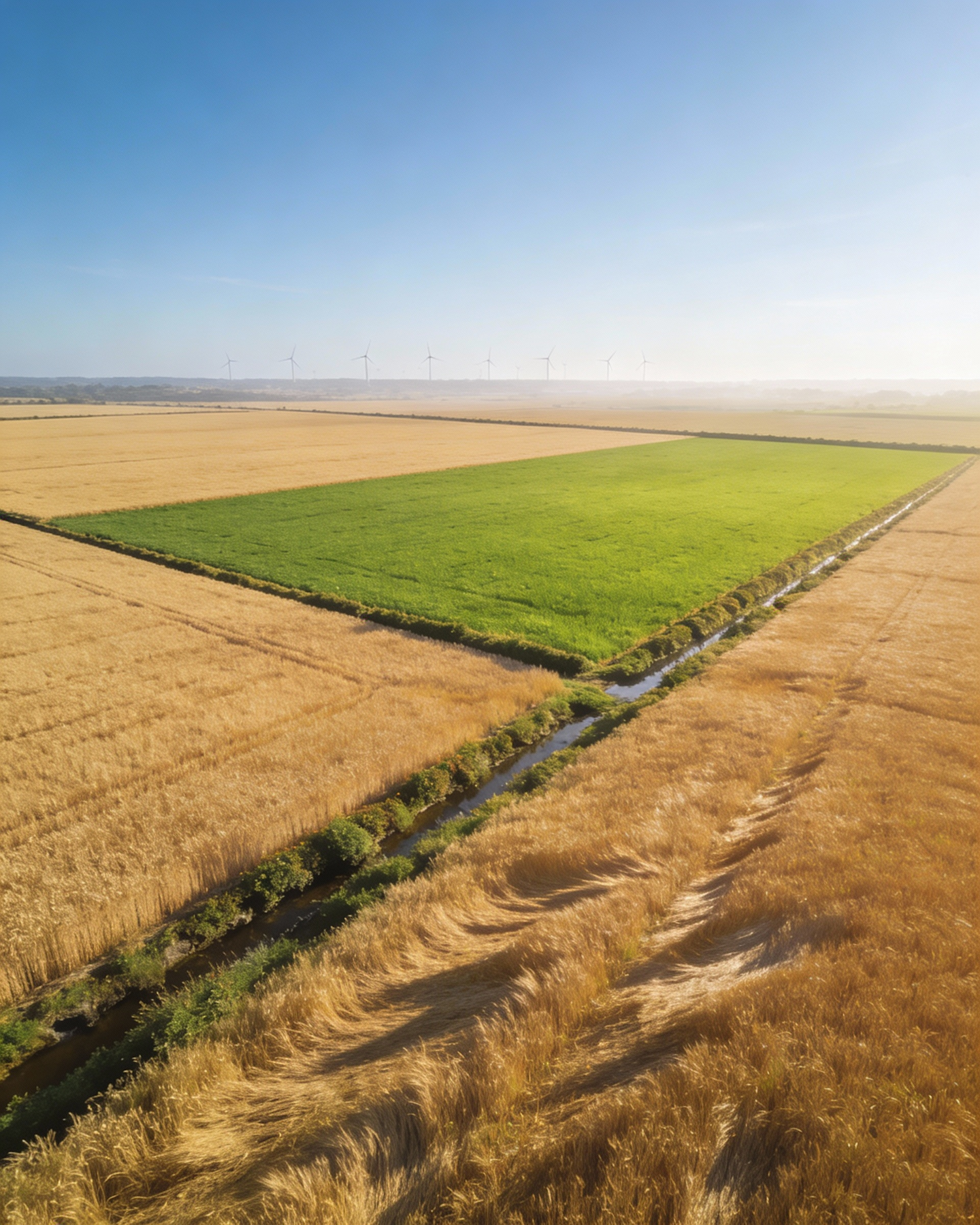 Ultra-realistic landscape photograph, wide patchwork farmland with distinct rectangular plots: one golden wheat, one bright green crop, separated by a thin hedgerow and a shallow drainage ditch, turbines faint on the horizon, horizon low third with clear sky, bright sunny conditions, consistent season lighting with smooth highlight roll-off and uniform light haze, crisp natural shadows, wheat matte-golden and not overly shiny, slight breeze motion across crops, 24 mm, f/7.1, ISO 100, 1/250 s; circular polarizer to enrich sky and reduce glare—avoid rainbow banding. Negative: dramatic storm sky, HDR look, starburst, god rays, blown highlights, wet-glitter wheat, halos, excessive clarity, neon saturation.