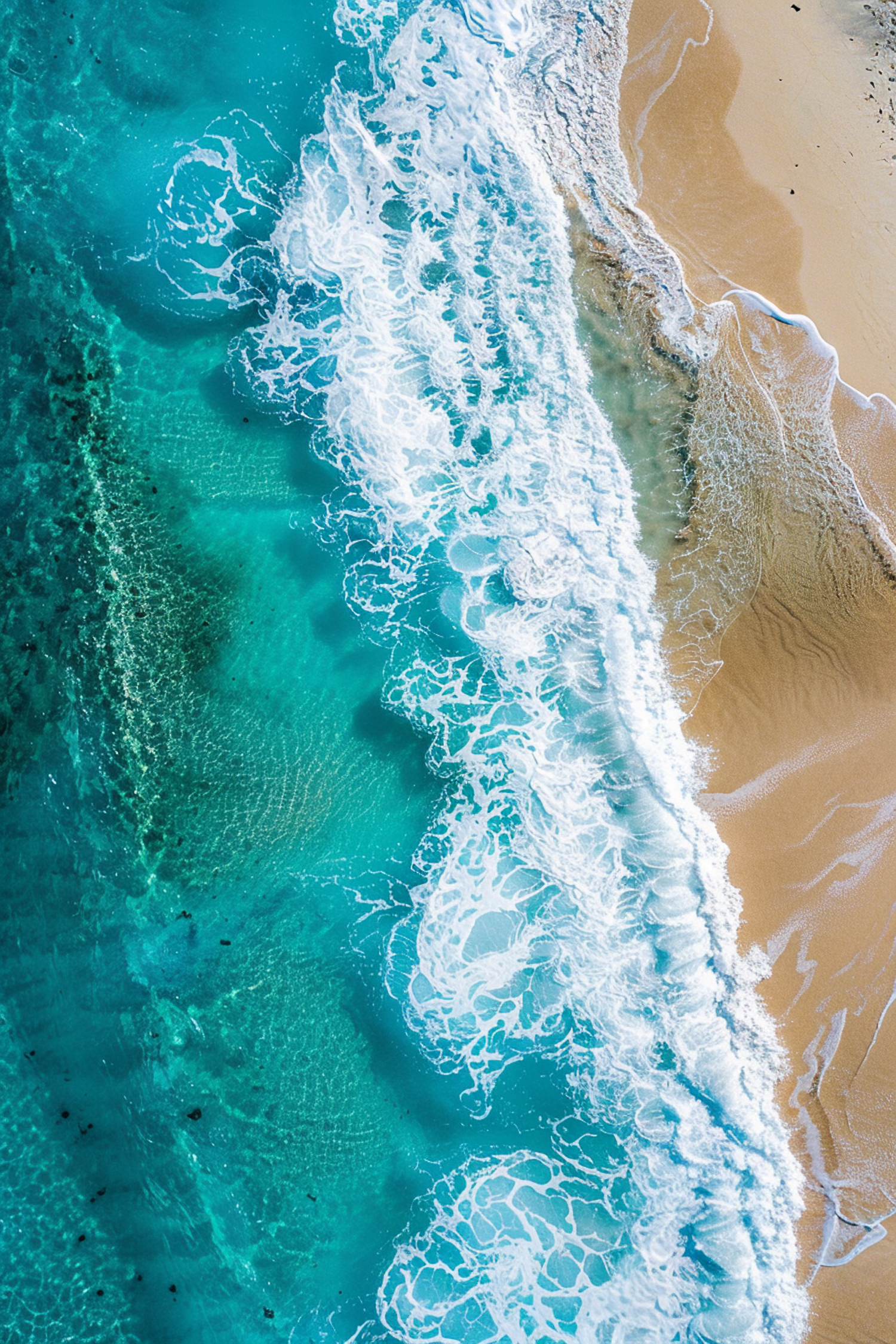 Aerial view of turquoise waves crashing on a golden sandy beach, creating stunning patterns and vibrant contrasts.