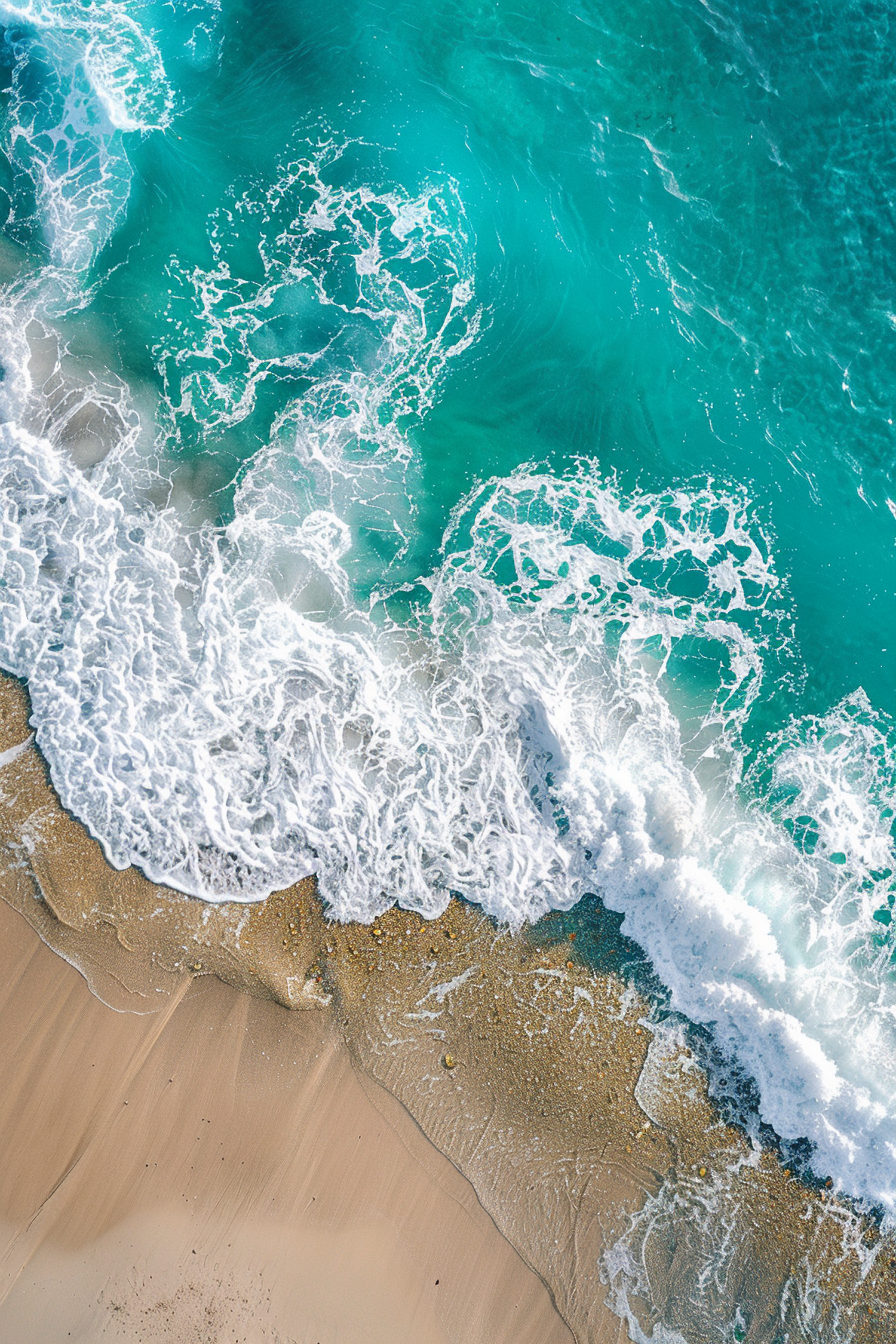 Aerial view of turquoise ocean waves crashing onto a golden sandy beach, creating white foam patterns and a serene coastal scene.