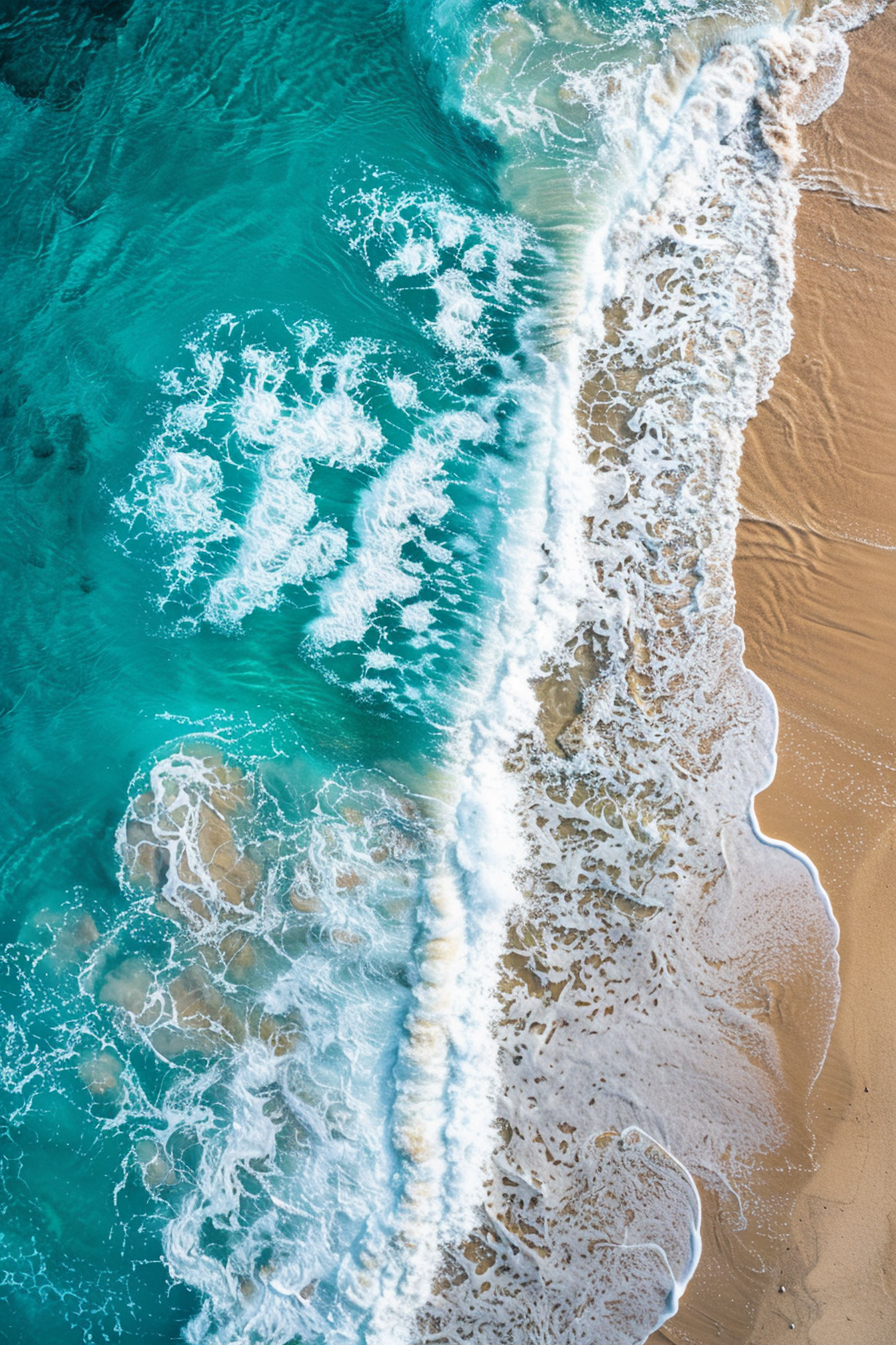 Aerial view of turquoise waves crashing onto a golden sandy beach, creating frothy patterns and a serene coastal scene.