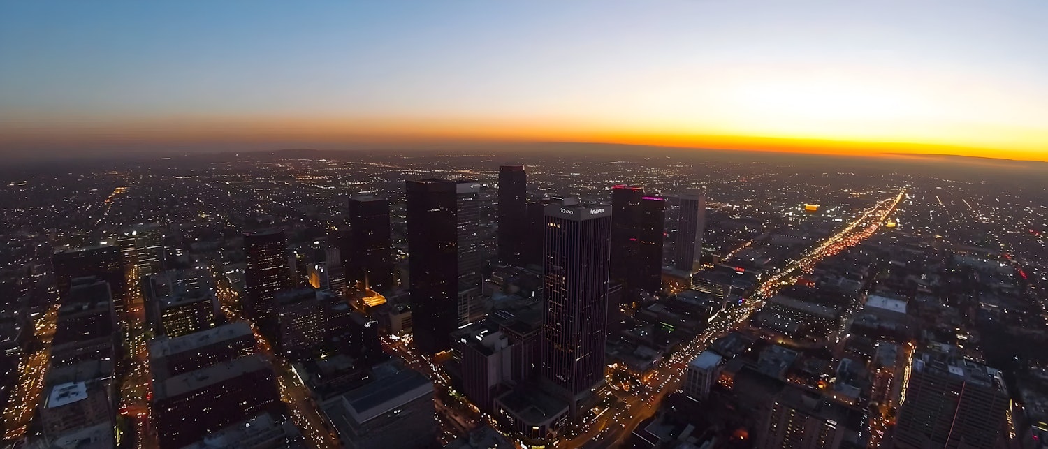 Dusk cityscape with skyscrapers, glowing city lights, and a vibrant sunset horizon. A major highway adds dynamic movement.
