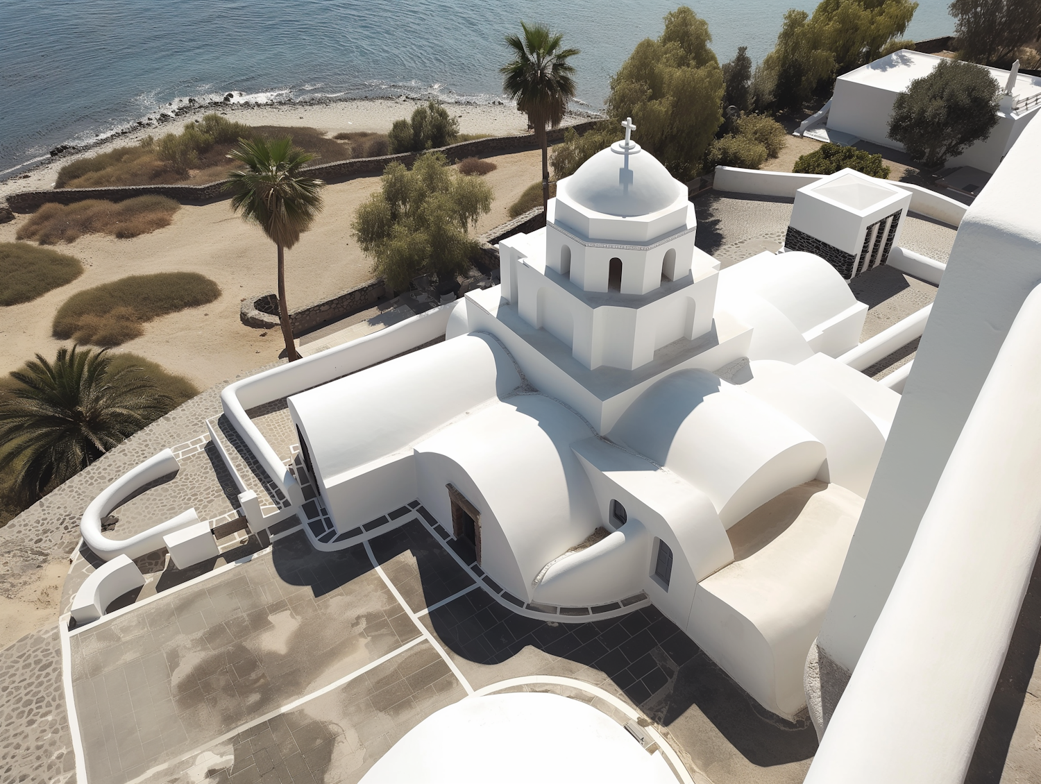 Whitewashed Greek church with dome by the sea, surrounded by palm trees and sandy landscape, under a clear blue sky.