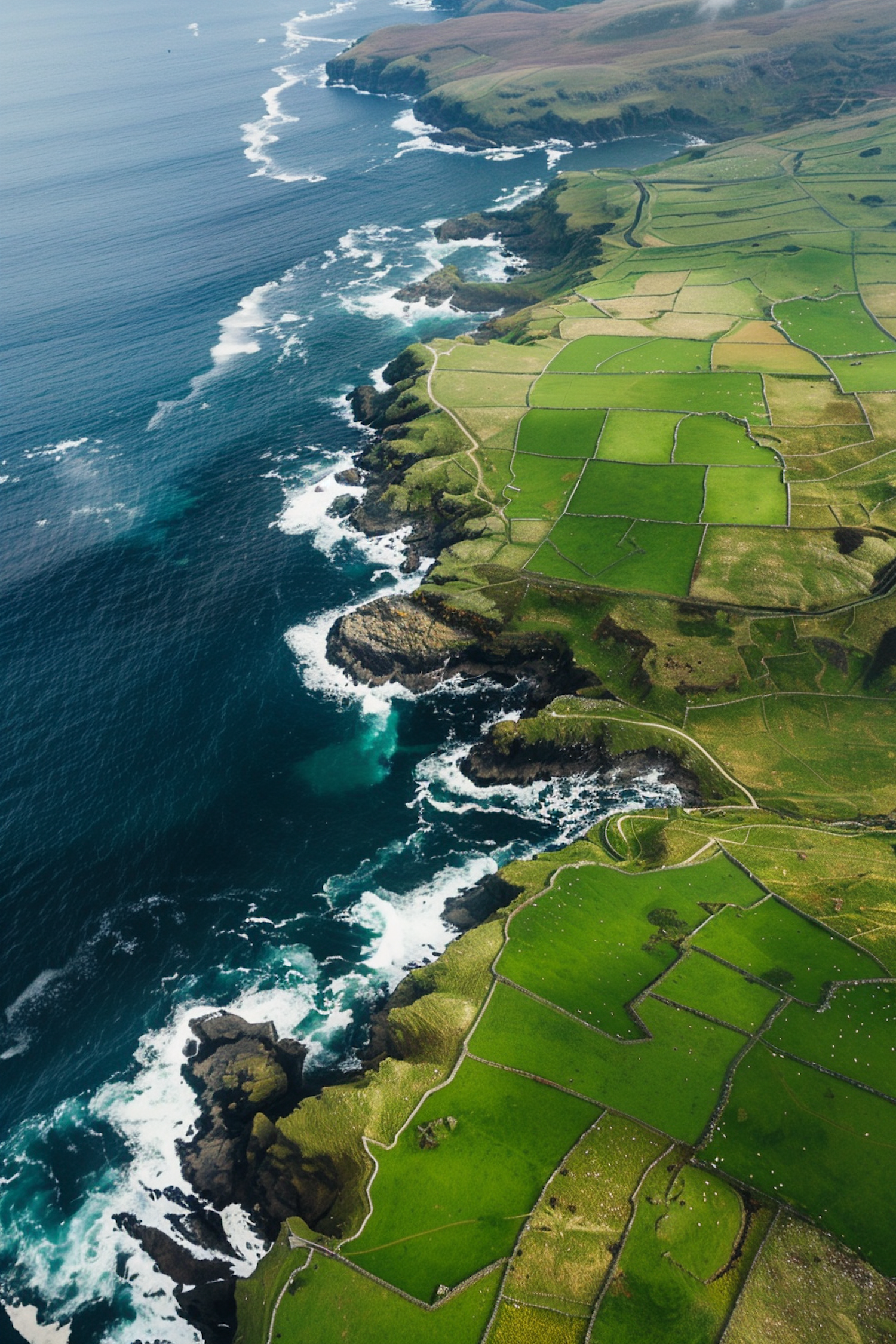 Aerial view of a stunning coastline with green fields and crashing waves, showcasing nature's beauty and rugged charm.