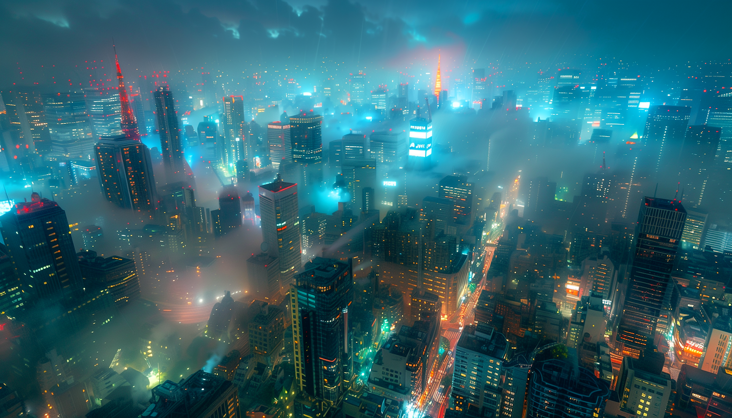 A mesmerizing cityscape at night with neon lights and fog, creating a futuristic and ethereal atmosphere.