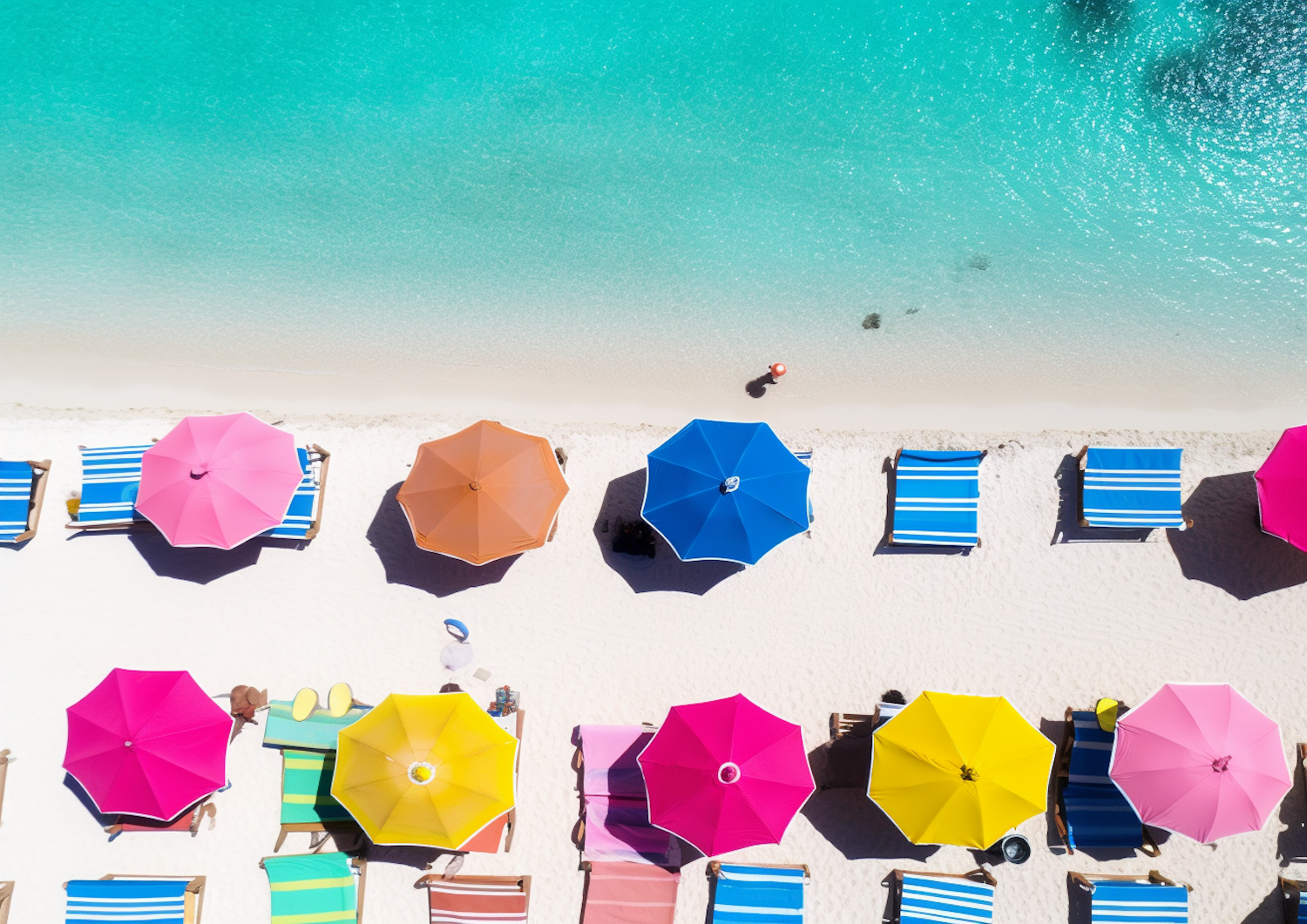 Aerial view of a colorful beach with vibrant umbrellas and lounge chairs by turquoise waters, creating a lively and inviting scene.