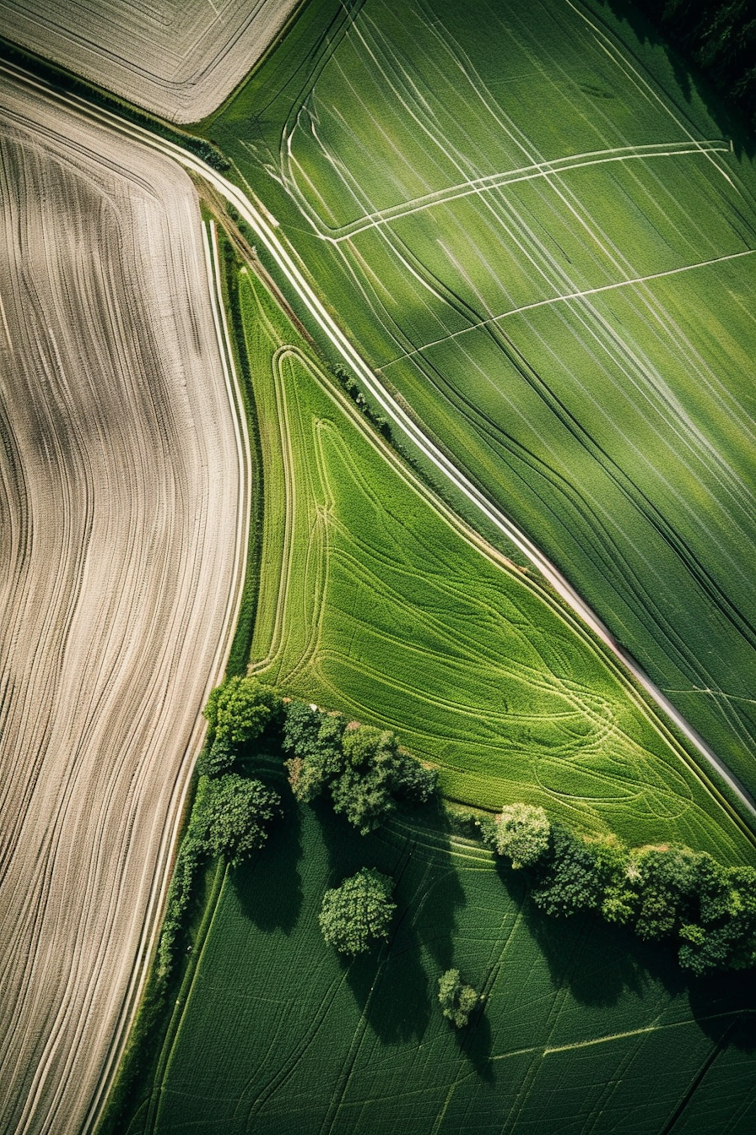 Aerial view of lush green and brown fields with geometric patterns and tree shadows, creating a striking landscape.