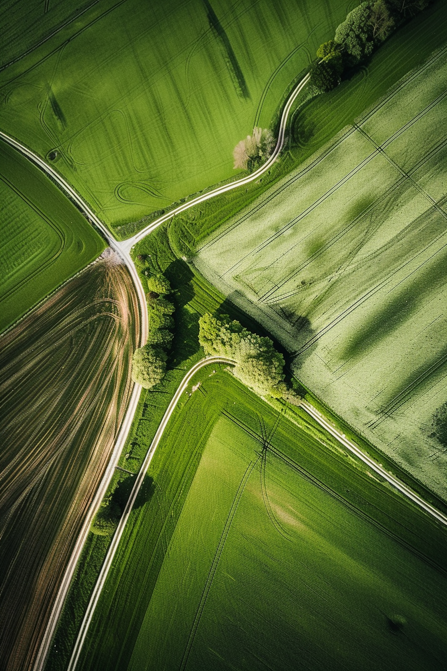 Aerial view of lush green fields with intersecting paths and trees, creating a geometric landscape pattern.