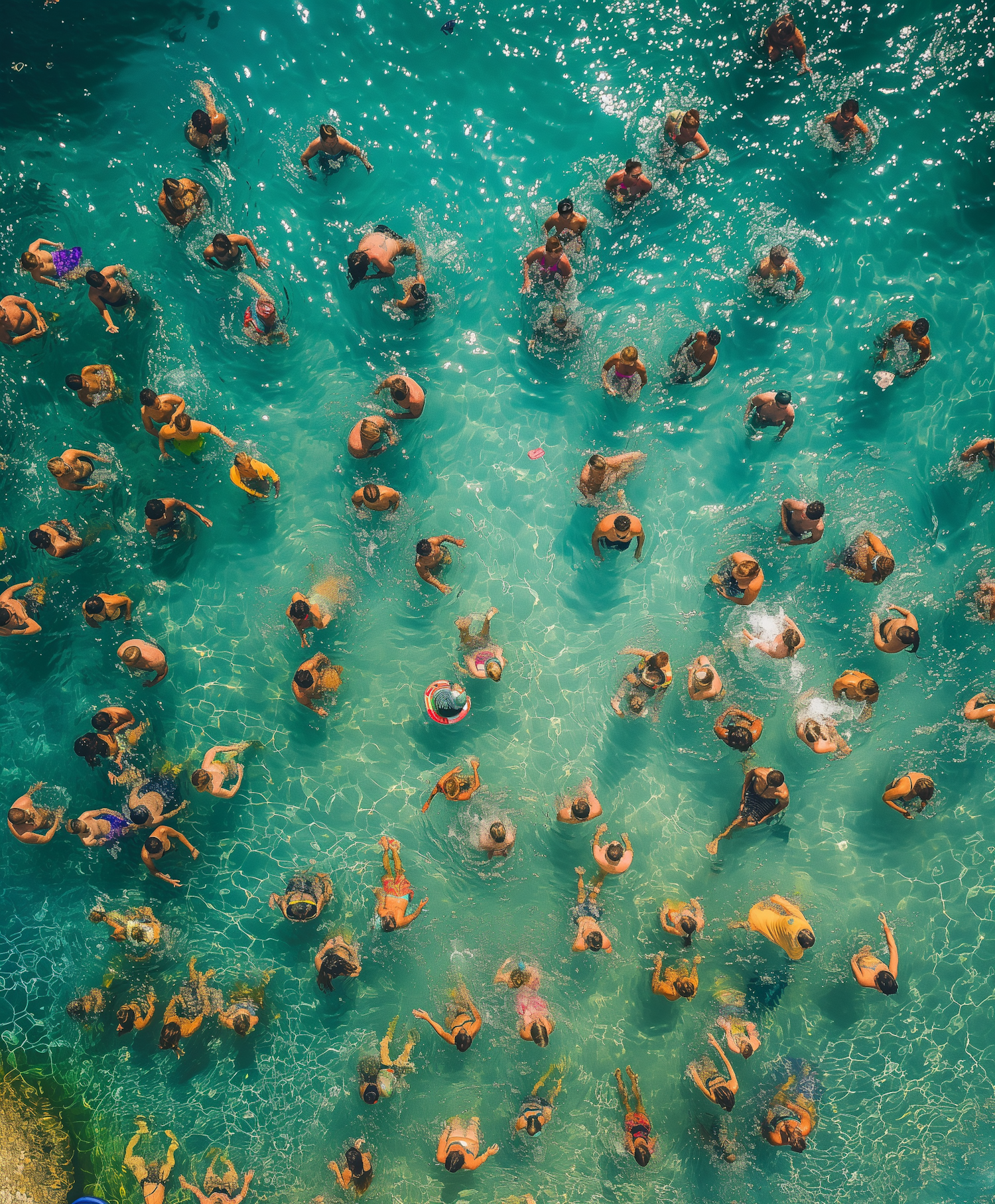 Aerial view of a crowded swimming area with people enjoying clear turquoise water, creating a lively summer atmosphere.
