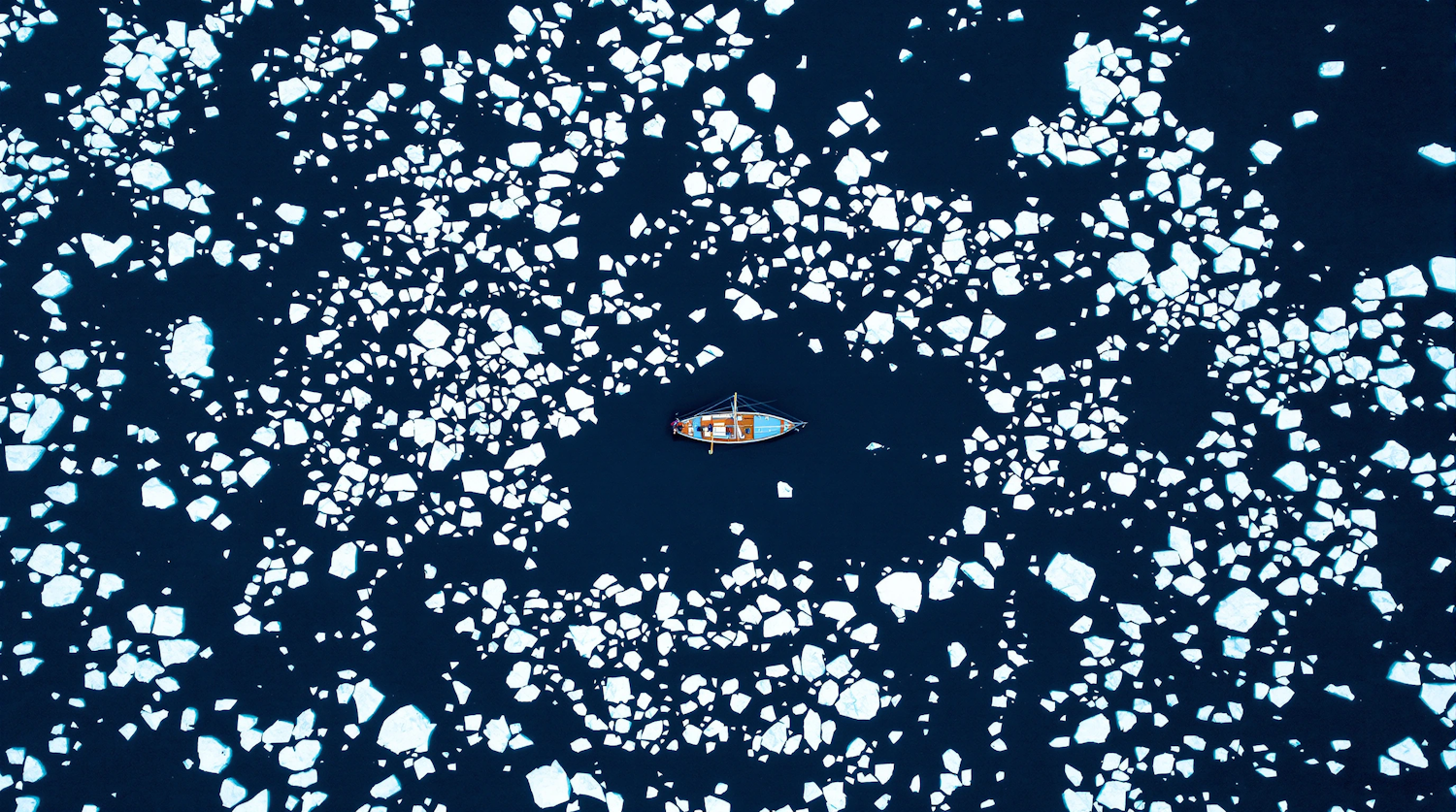 Aerial view of a small boat navigating through scattered ice floes on dark blue water, creating a striking contrast and sense of isolation.