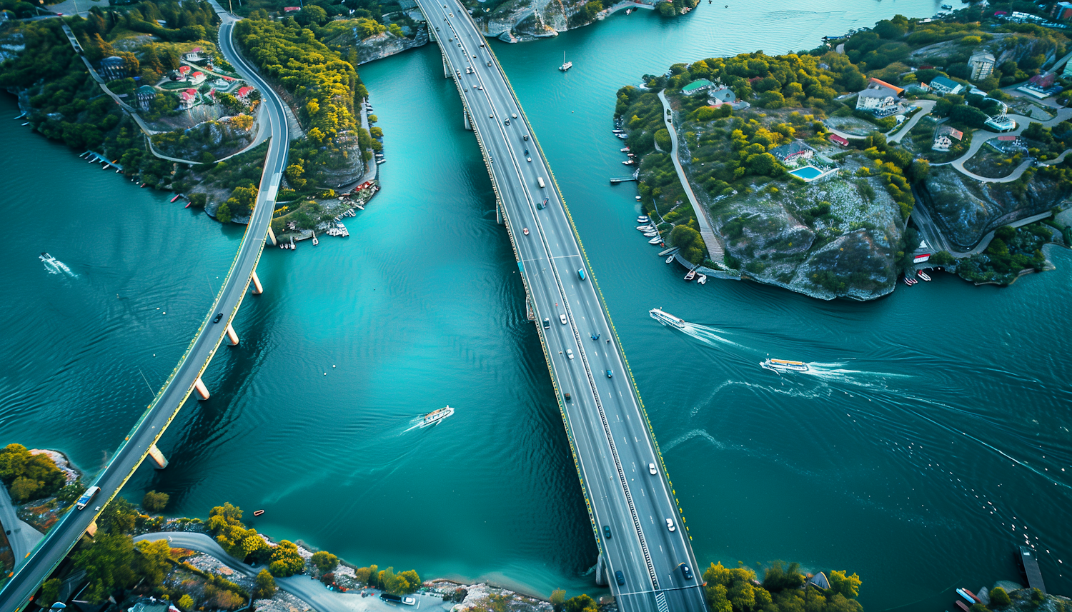 Aerial view of turquoise waters with two bridges, lush green islands, and boats. Busy traffic and colorful houses create a vibrant scene.