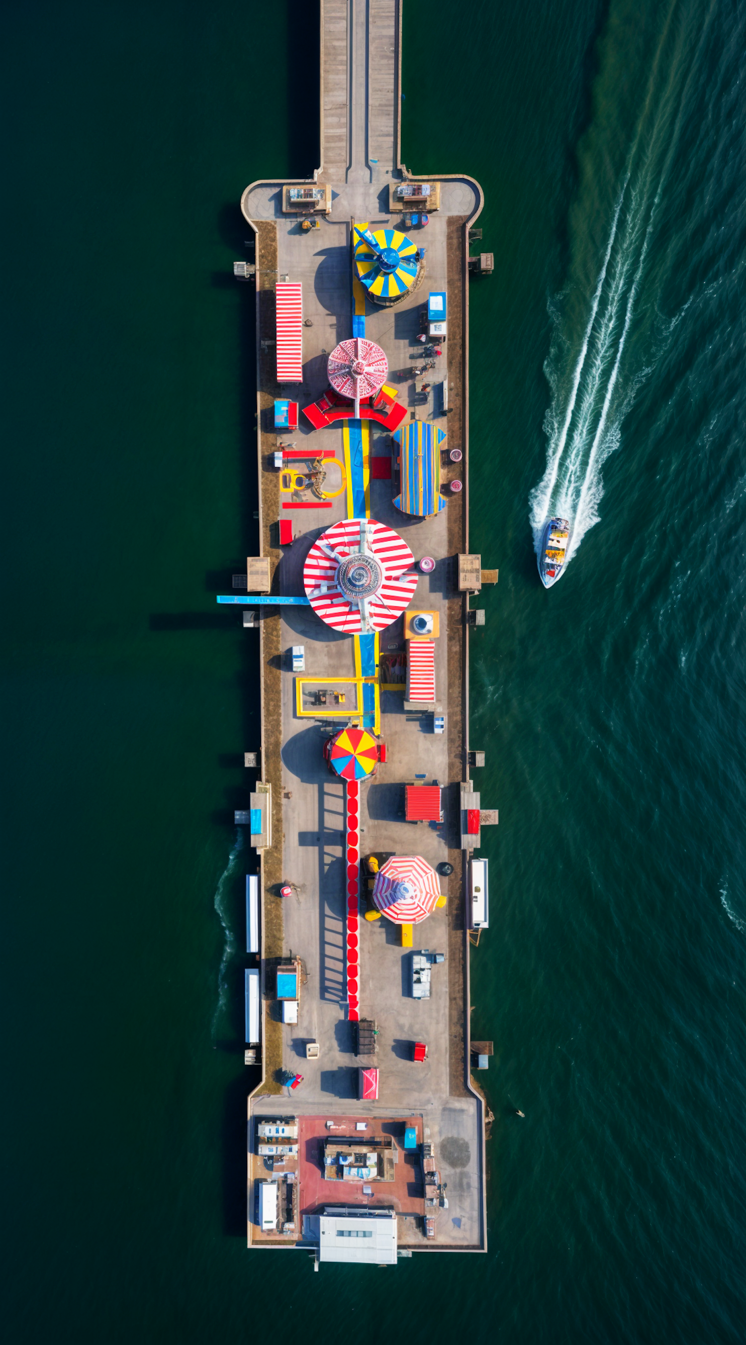 Aerial view of a colorful amusement pier with vibrant tents and rides, set against the deep green ocean waters.