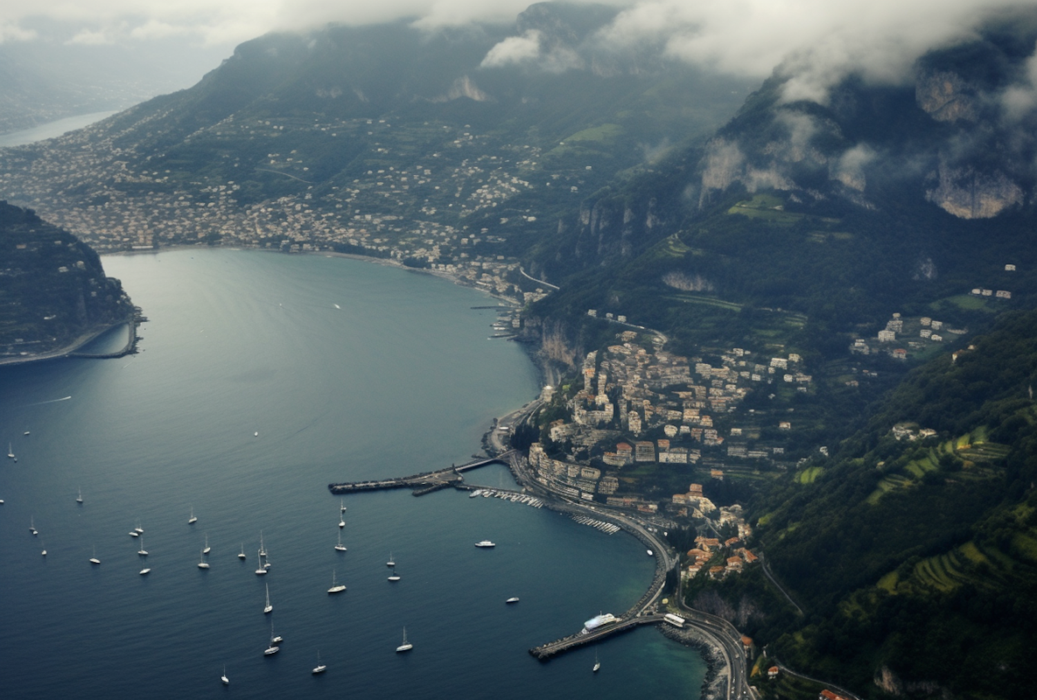 Aerial view of a coastal town with lush mountains, a serene bay, and sailboats. Low clouds add a mystical touch to the picturesque scene.