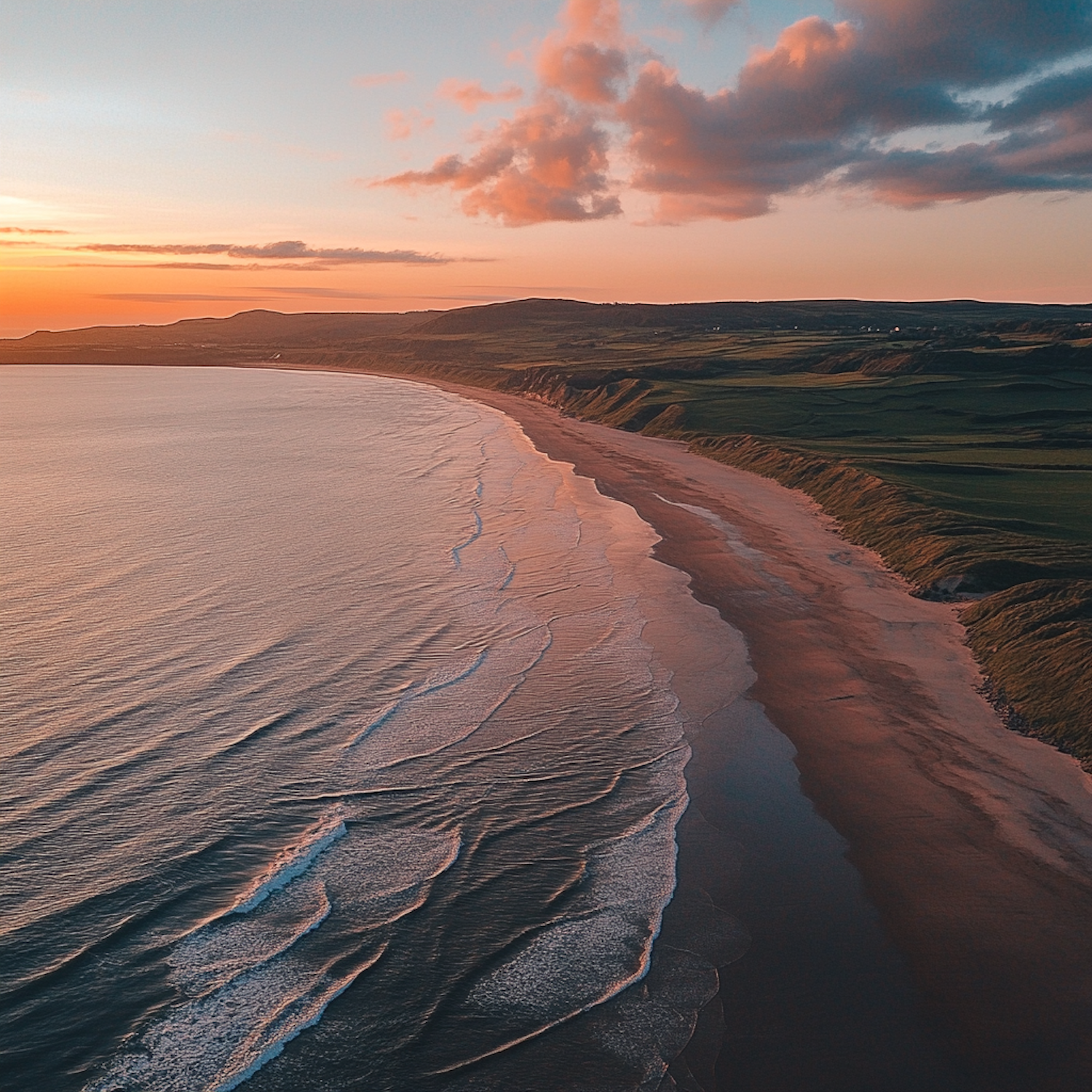 Aerial view of a stunning coastline at sunset with golden sands, gentle waves, and a vibrant sky.
