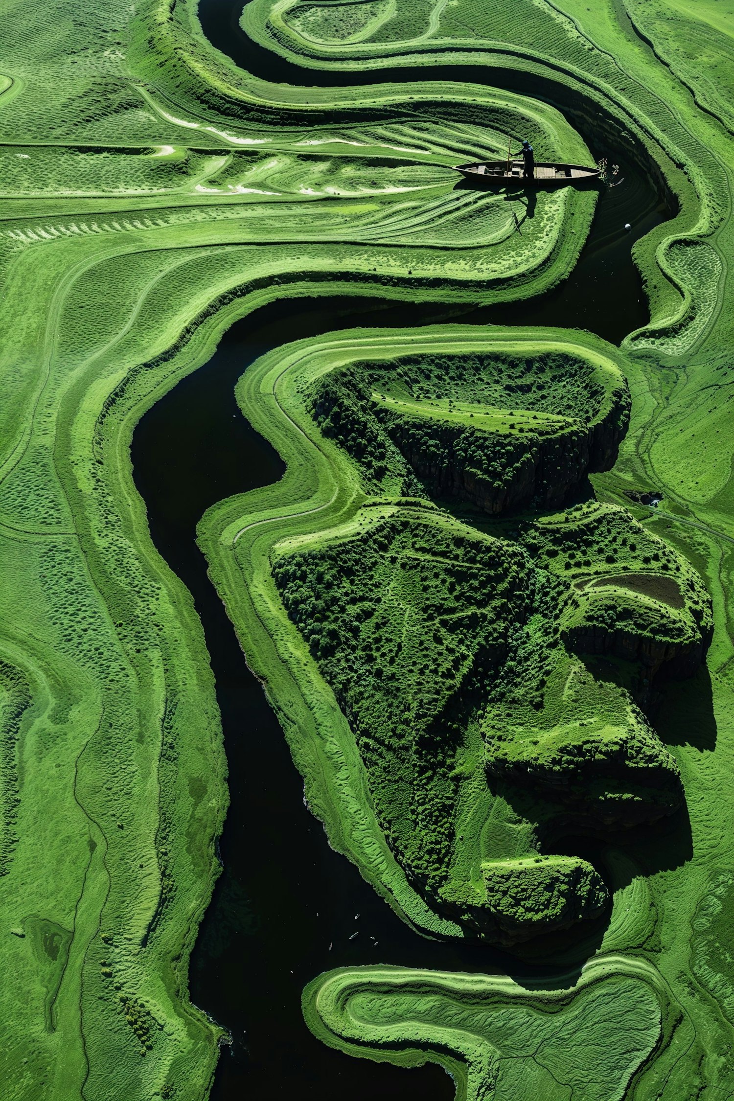Aerial view of lush green terraces and winding river with a boat, showcasing nature's intricate patterns and serene beauty.