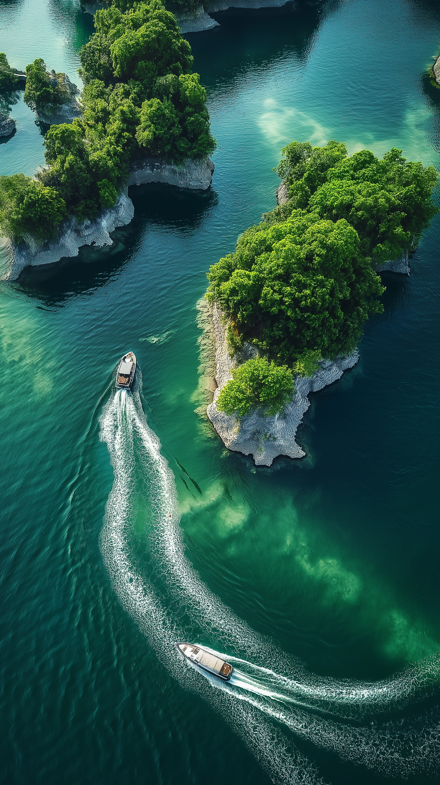 Aerial view of boats navigating through emerald waters and lush islands, creating dynamic white trails in a serene, vibrant landscape.
