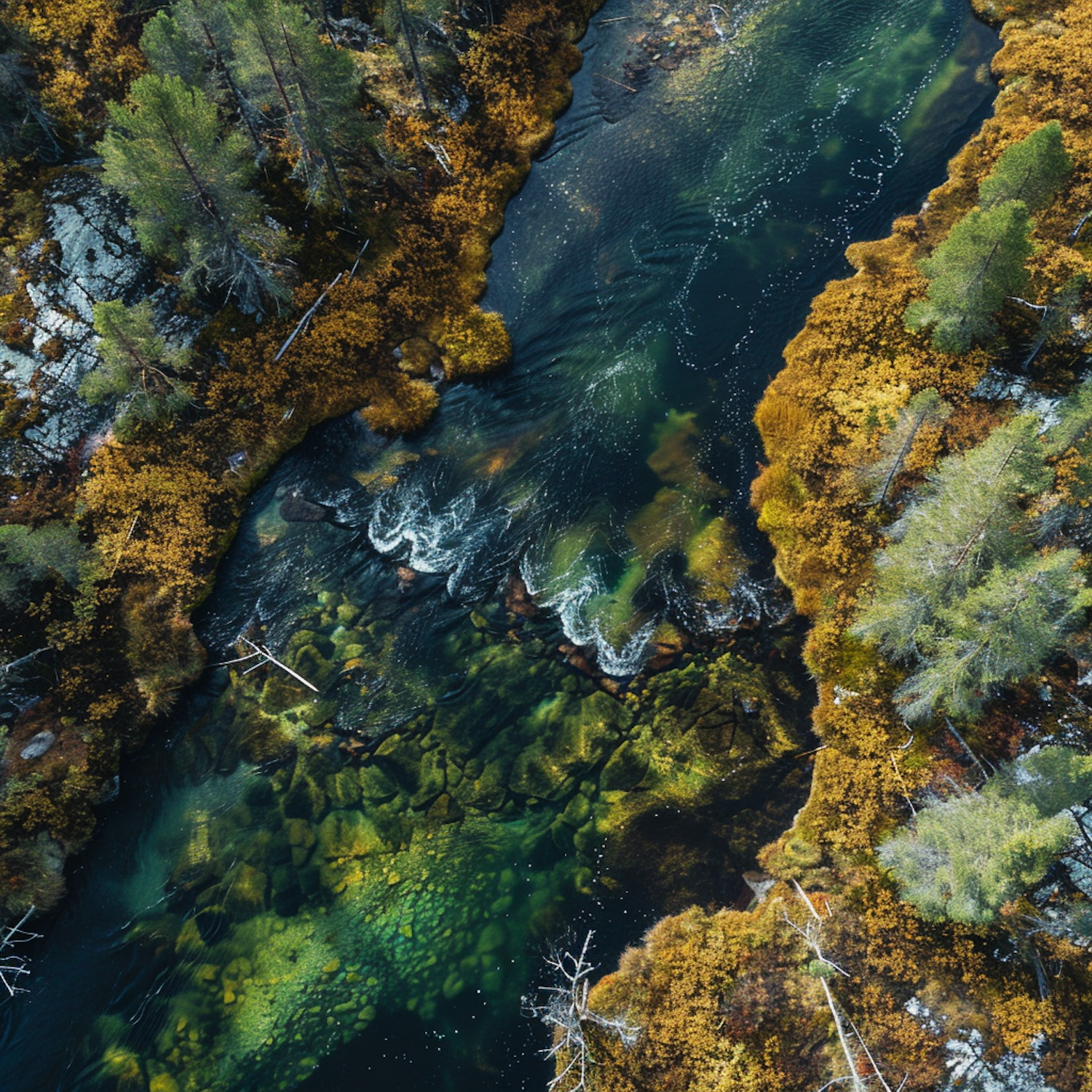 Aerial view of a lush forest with a winding green river, surrounded by vibrant trees and rocky banks.