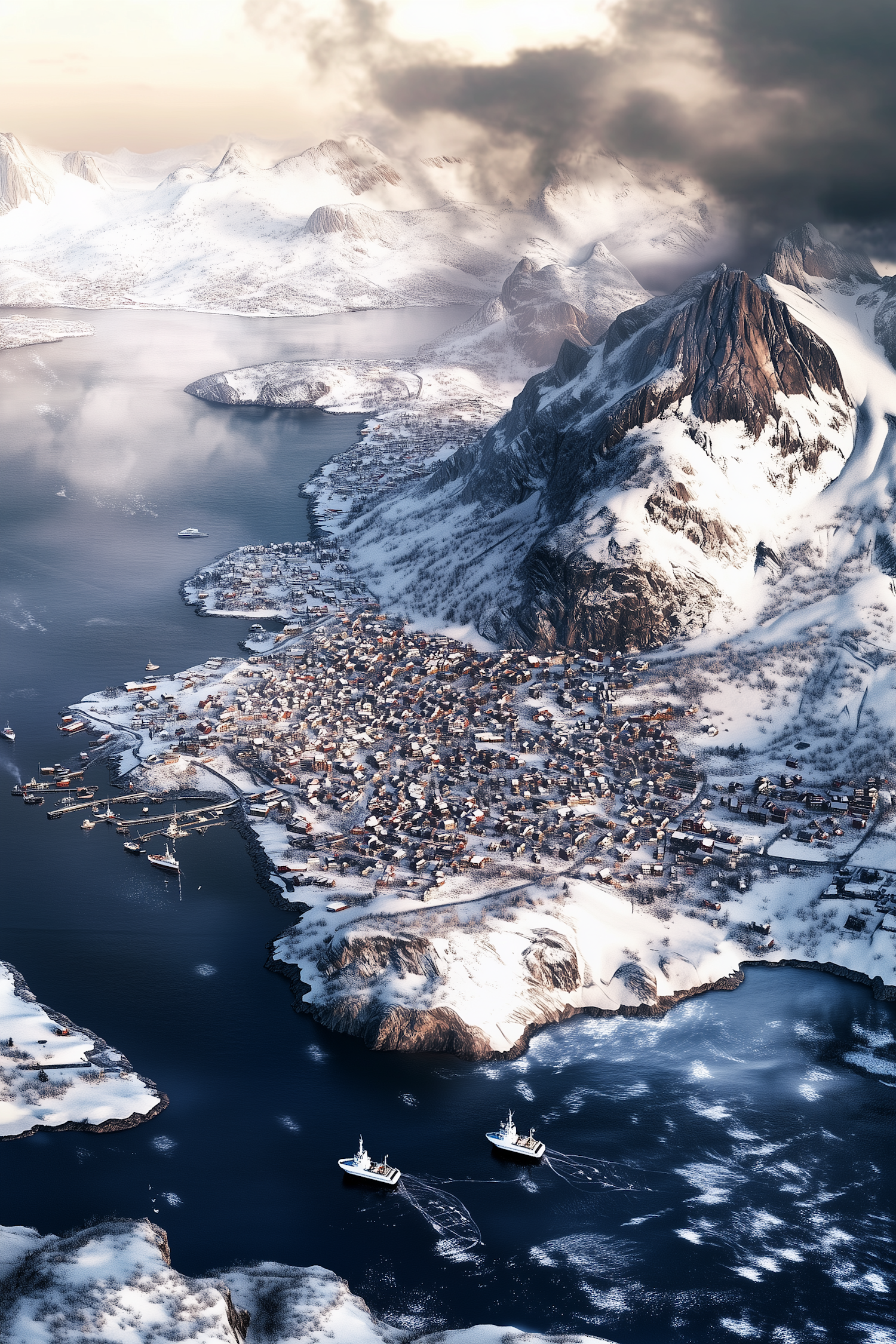 Aerial view of a snowy coastal town with colorful houses, majestic mountains, and ships in icy waters under dramatic clouds.
