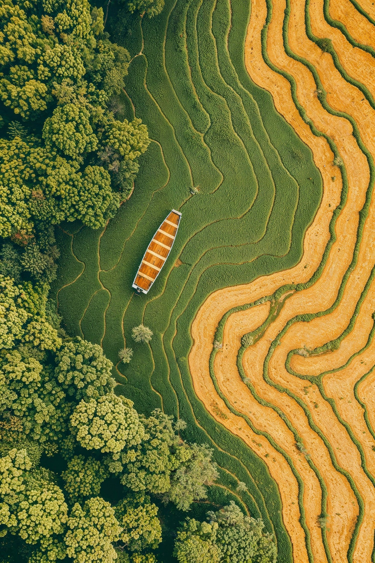 Aerial view of a wooden boat on vibrant green and golden terraced fields, surrounded by lush trees.