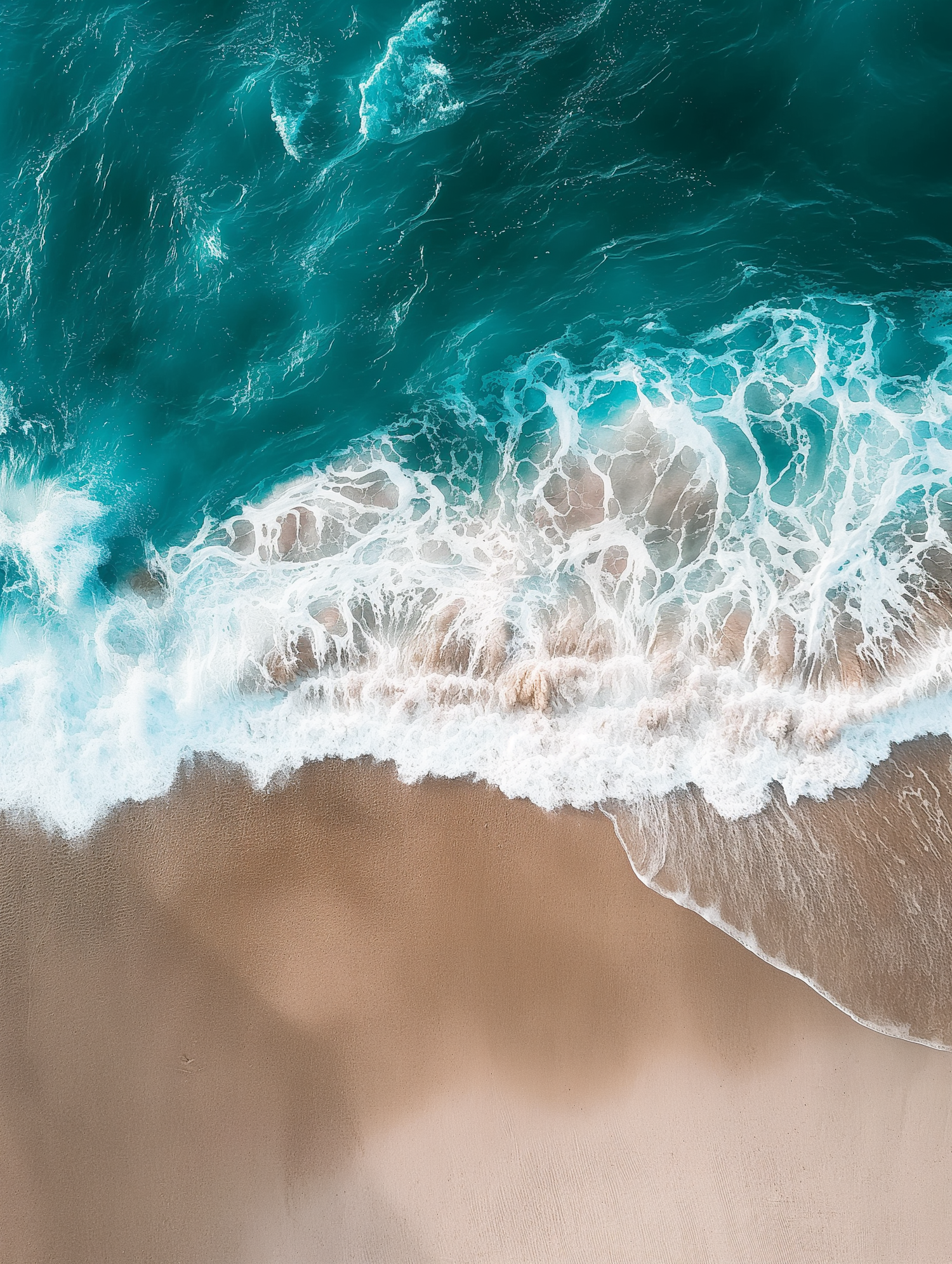 Aerial view of turquoise waves crashing onto a sandy beach, creating a serene and vibrant coastal scene.