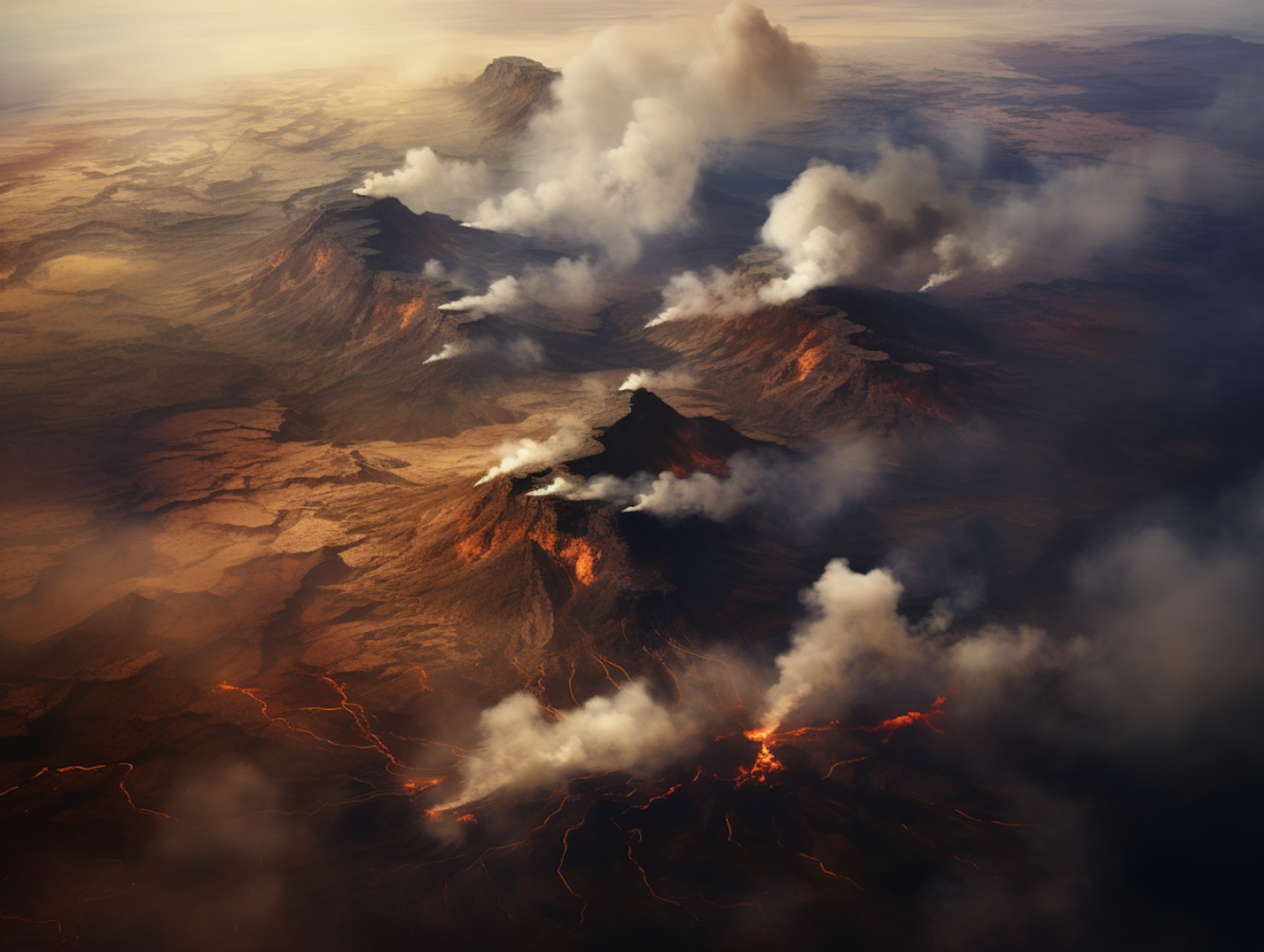 Aerial view of active volcanoes with smoke and lava, set in a barren landscape under a hazy, golden sky.