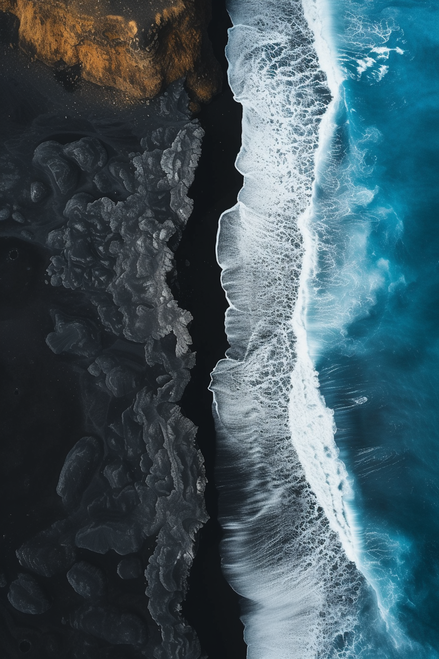 Aerial view of a black sand beach meeting vibrant blue ocean waves, showcasing dramatic contrast and dynamic textures.