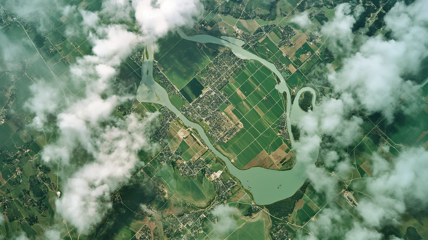 Aerial view of a winding river through patchwork fields and rural settlements, partially obscured by scattered clouds.