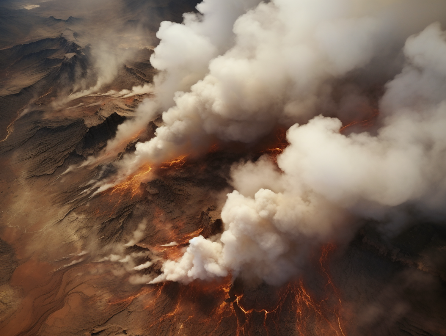 Aerial view of a volcanic eruption with thick smoke and fiery lava flows, showcasing nature's raw power and beauty.