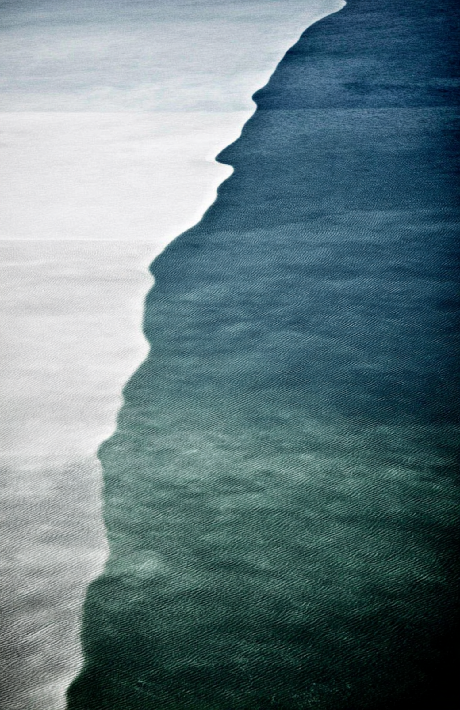 Aerial view of two contrasting water bodies meeting, with a wavy boundary separating light and dark hues, creating a striking visual contrast.