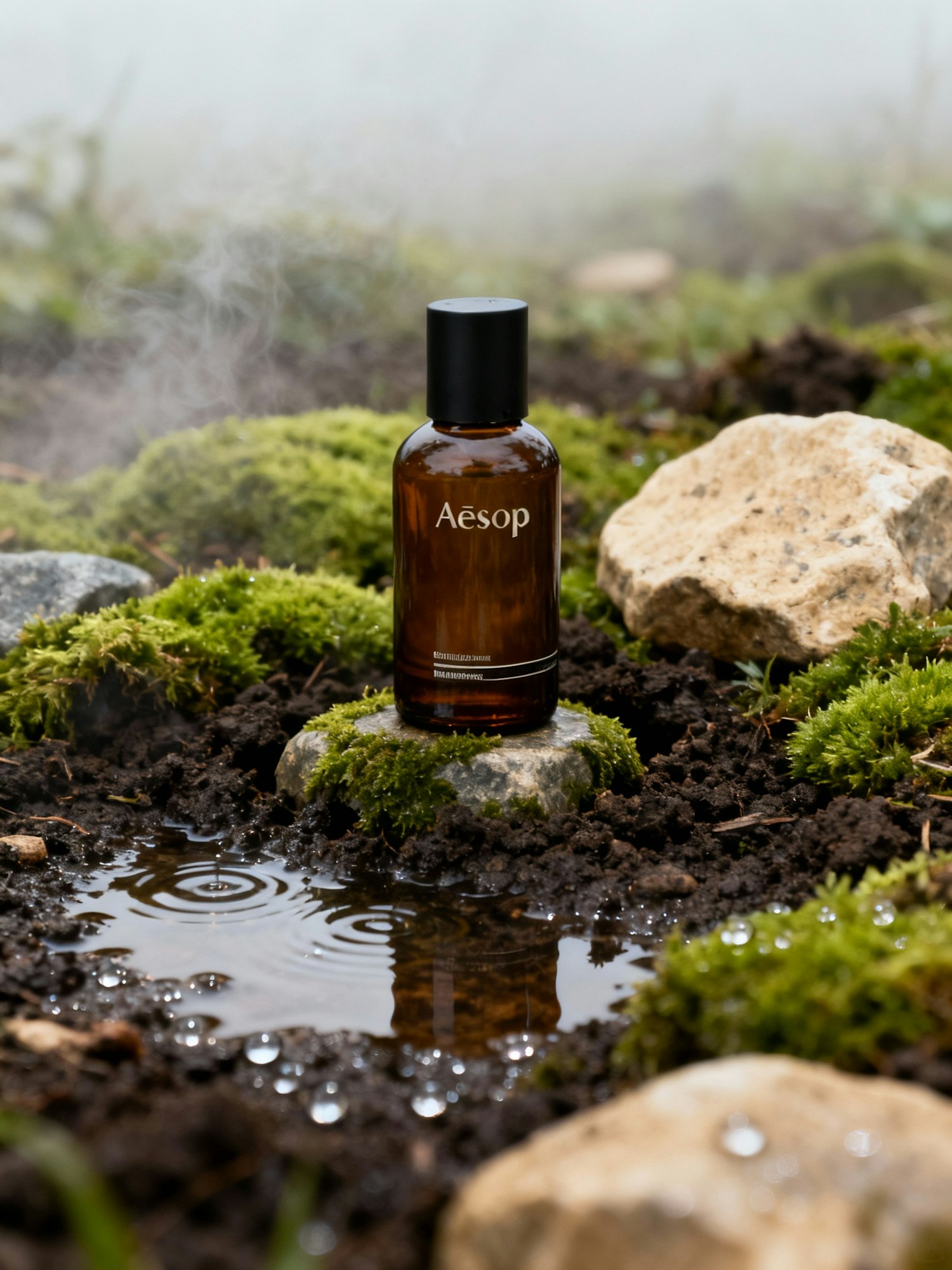 A brown Aesop bottle on mossy rocks by a puddle, surrounded by lush greenery and stones, creating a serene and natural vibe.