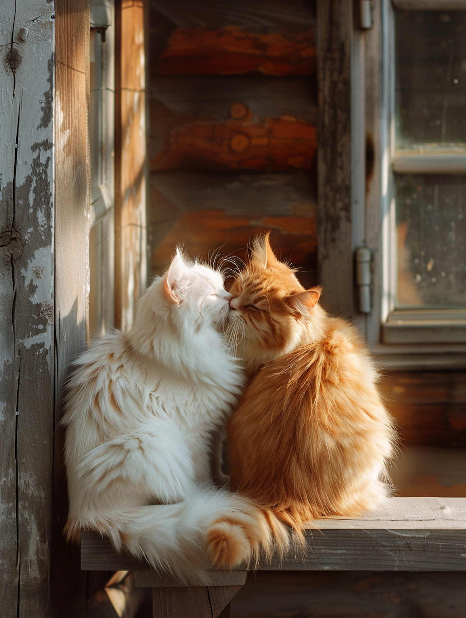 Two fluffy cats, one white and one orange, share a tender moment on a rustic wooden bench bathed in golden sunlight.