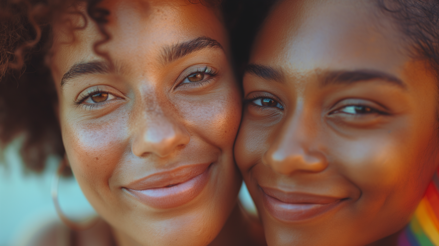 Close-up of two smiling Black women with glowing skin, showcasing warmth and connection. Soft focus highlights their natural beauty.