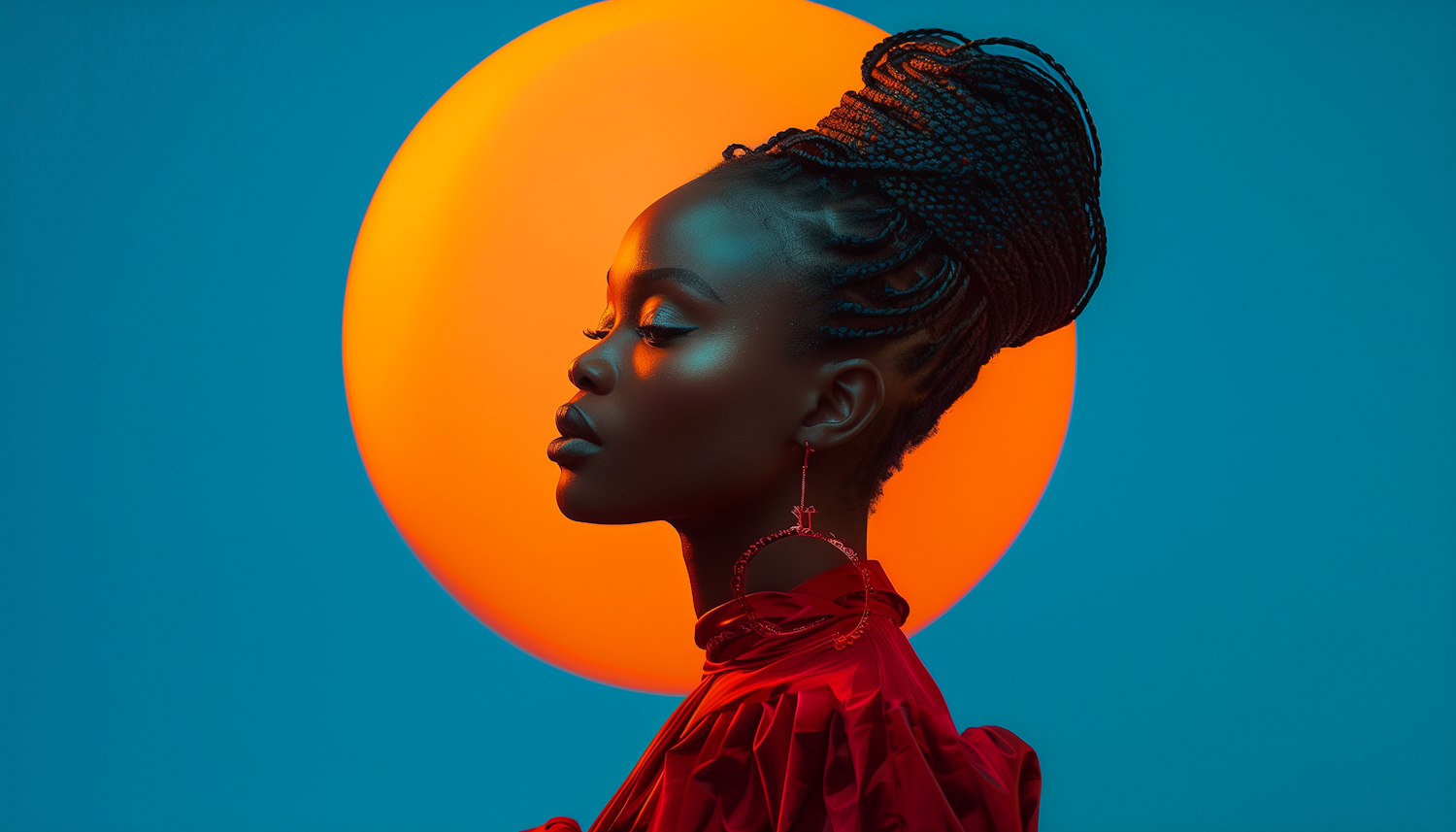 Profile of a Black woman with braided hair against a vibrant orange and teal background, wearing red attire and large earrings.