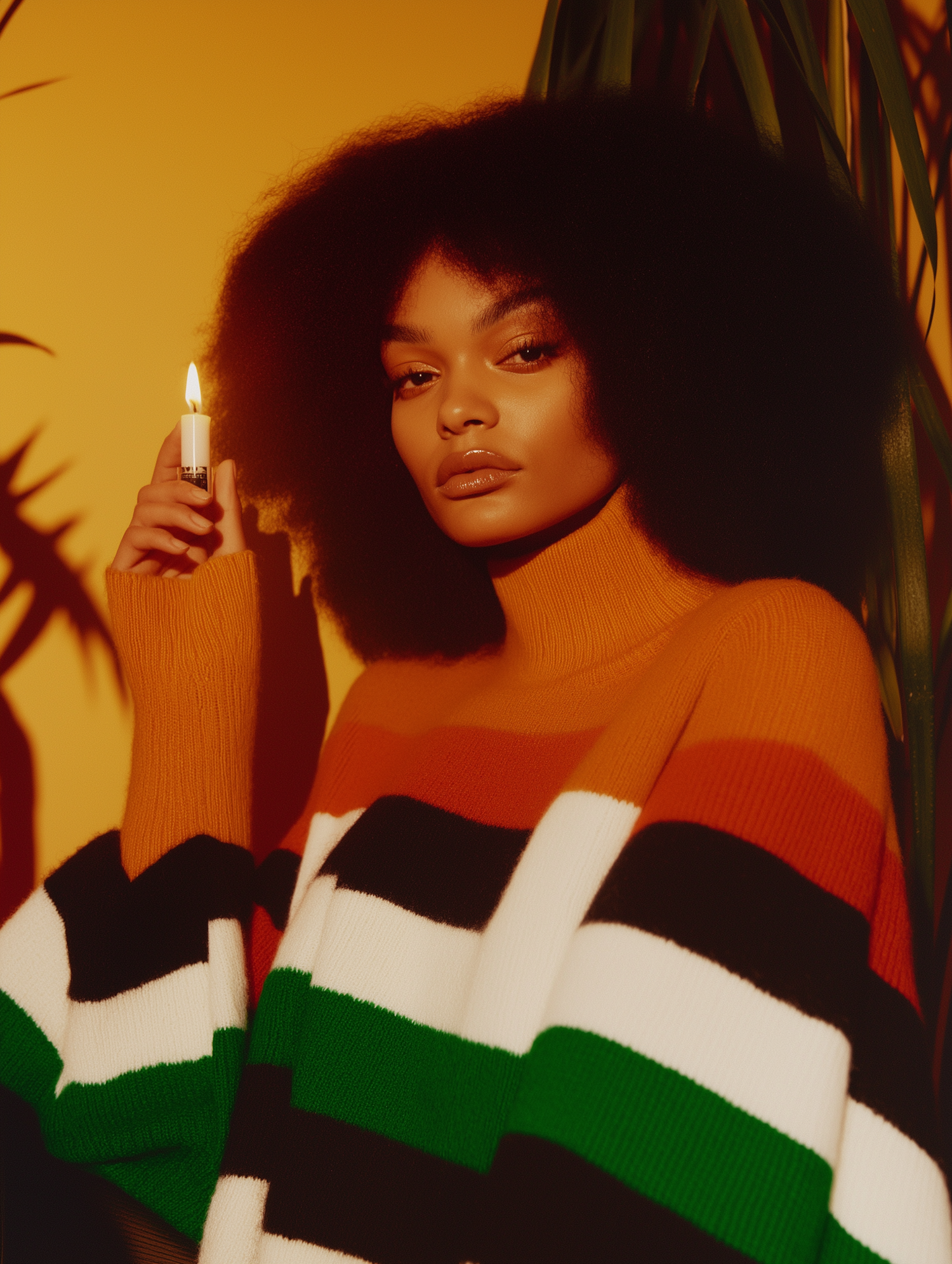 Stylish woman with afro hair in a bold striped sweater holding a lit candle against a warm yellow background with green leaves.
