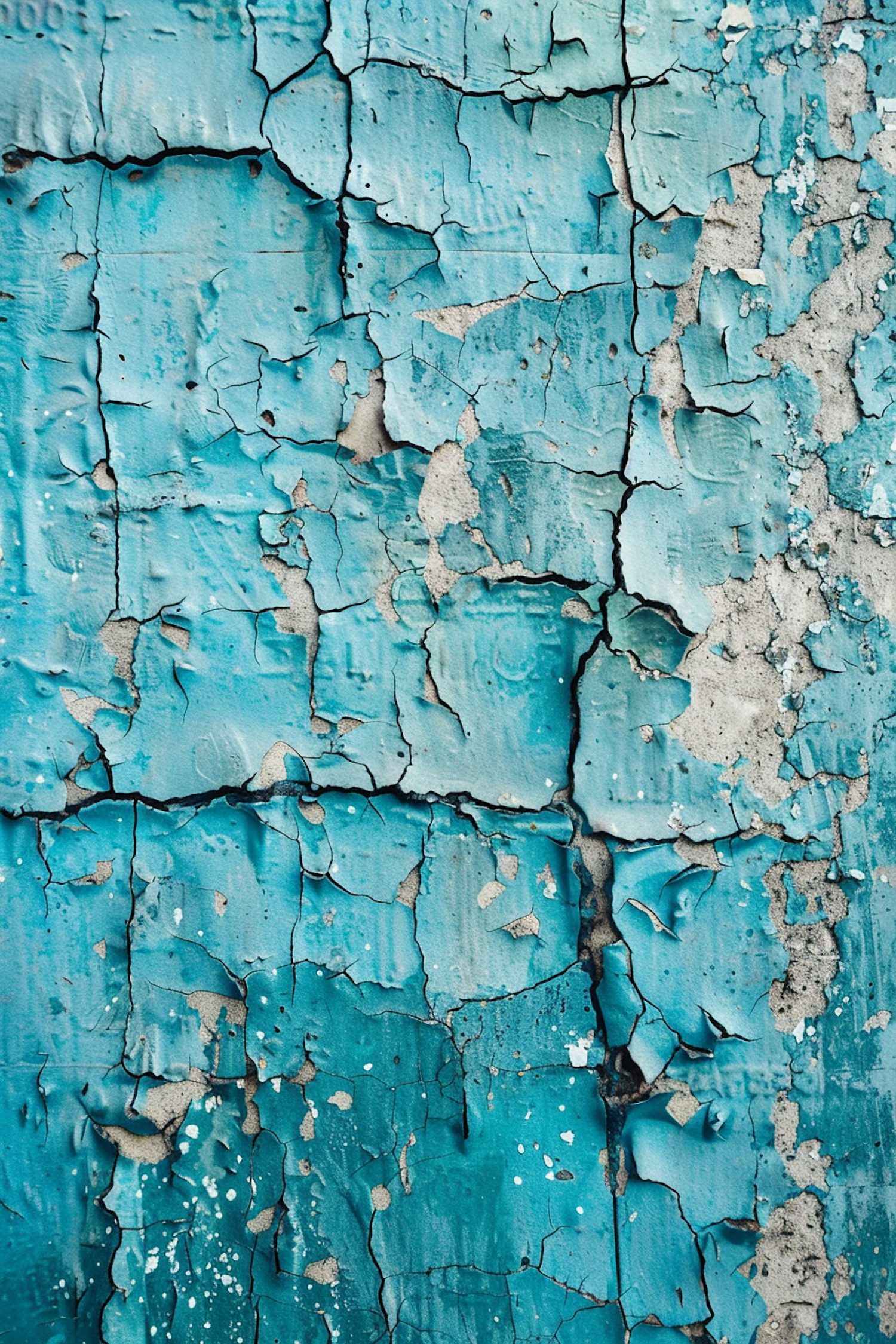 Close-up of a wall with peeling turquoise paint, showcasing intricate cracks and textures, revealing a rough surface beneath.