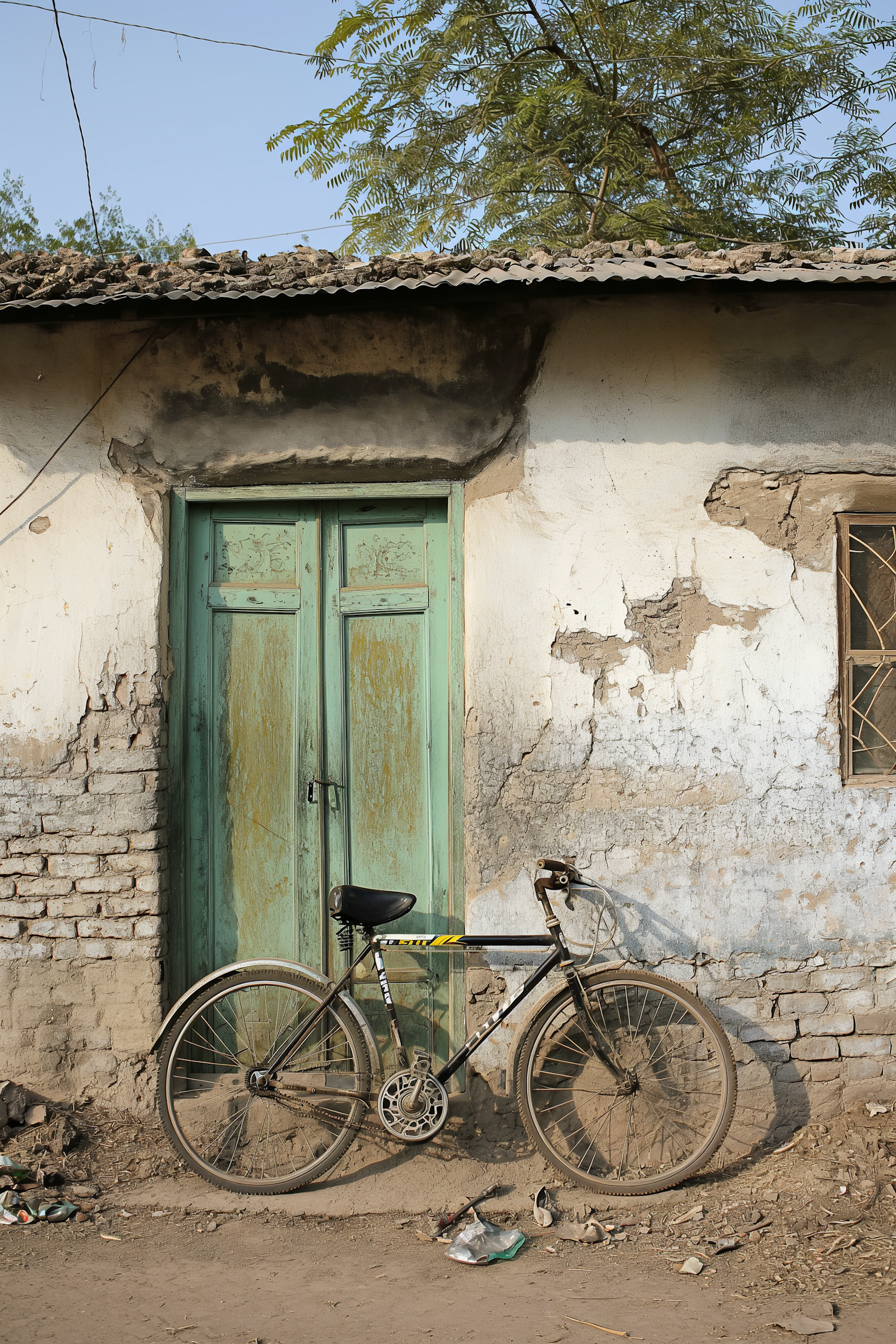 Rustic bicycle against a weathered building with a green door, showcasing urban decay and charm.