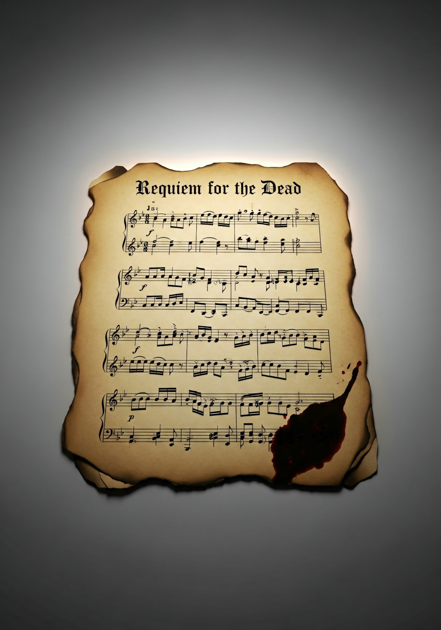 A weathered music sheet titled 'Requiem for the Dead' with burnt edges and a dramatic red stain, evoking a mysterious and somber mood.