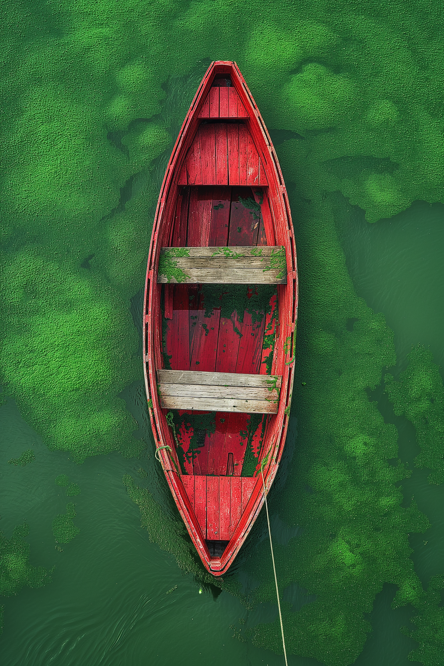 Aerial view of a red wooden boat on green algae-covered water, creating a striking color contrast.